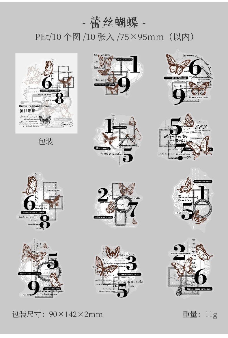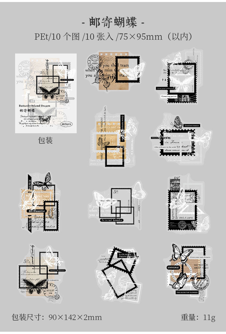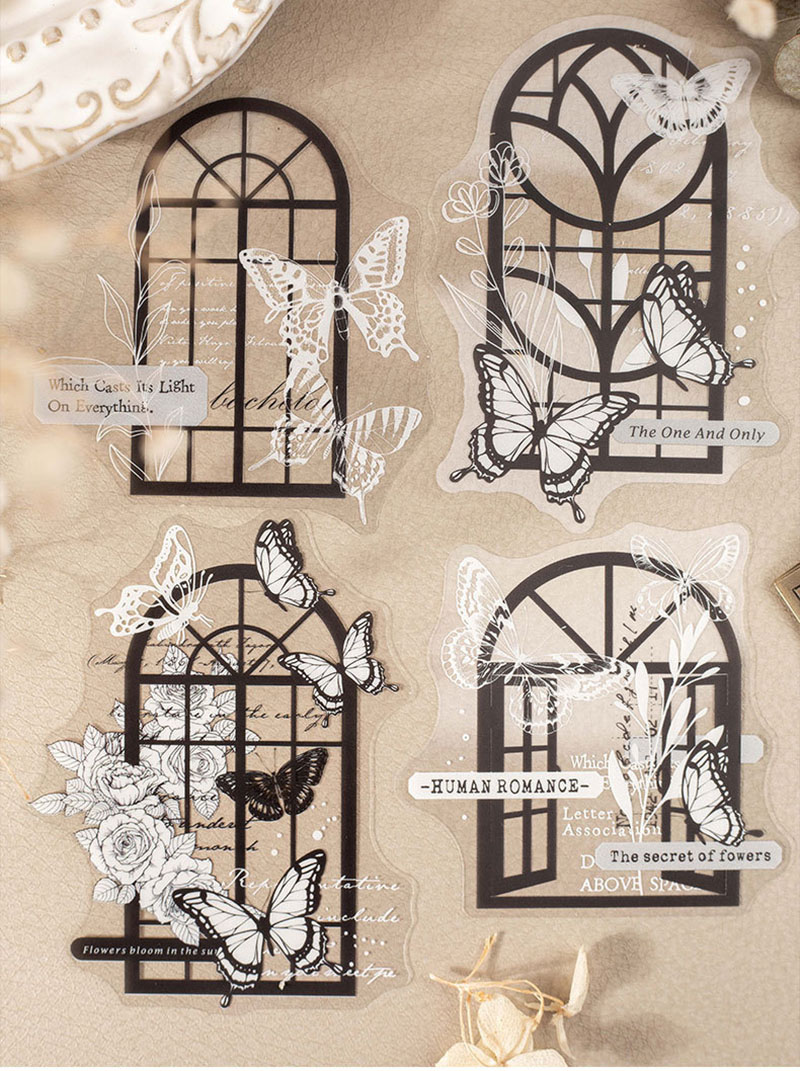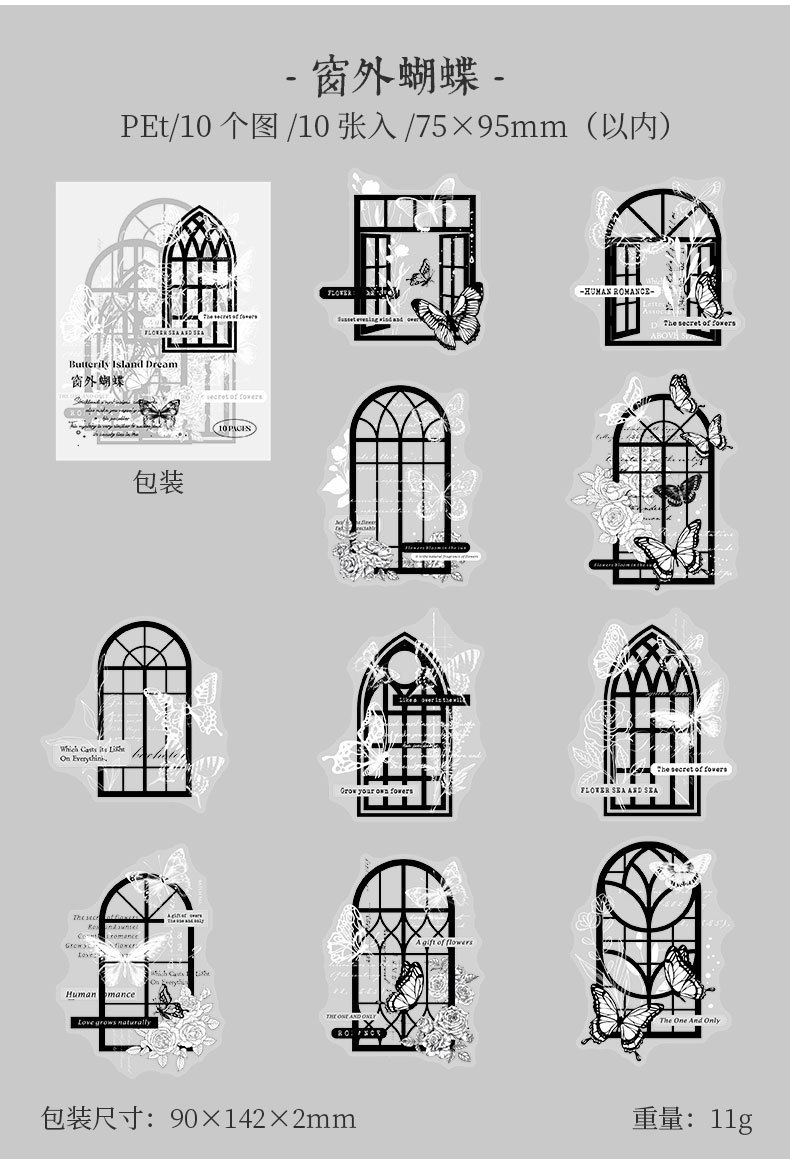カフェ風 文具 PETシール貼紙 封口貼 アンティーク 手帳素材 蝶 切手 窓 イラスト 幾何学 10枚入