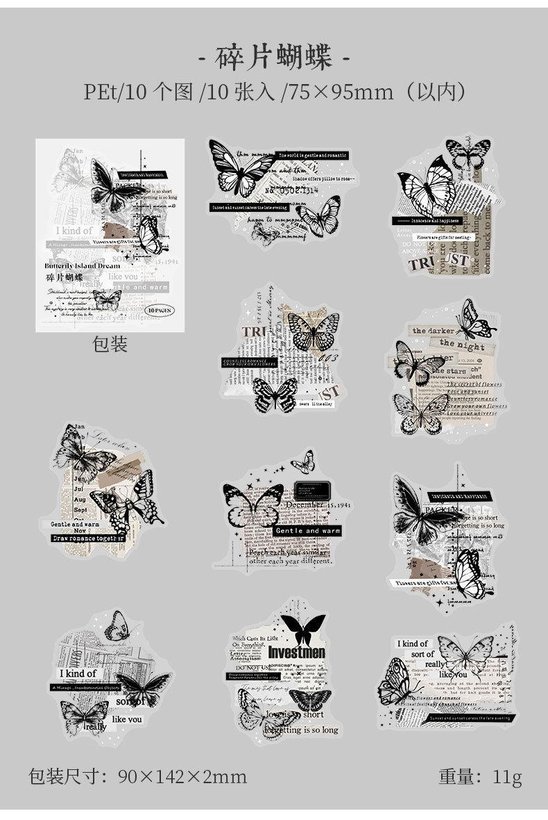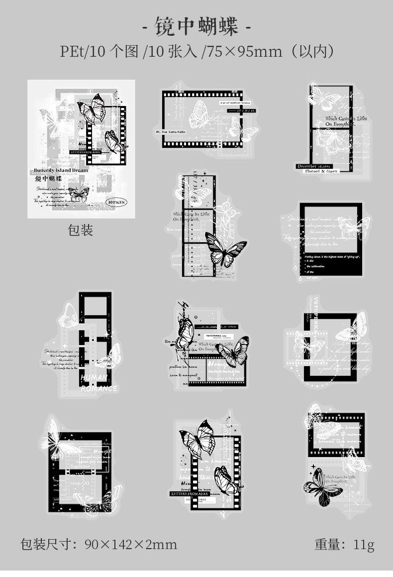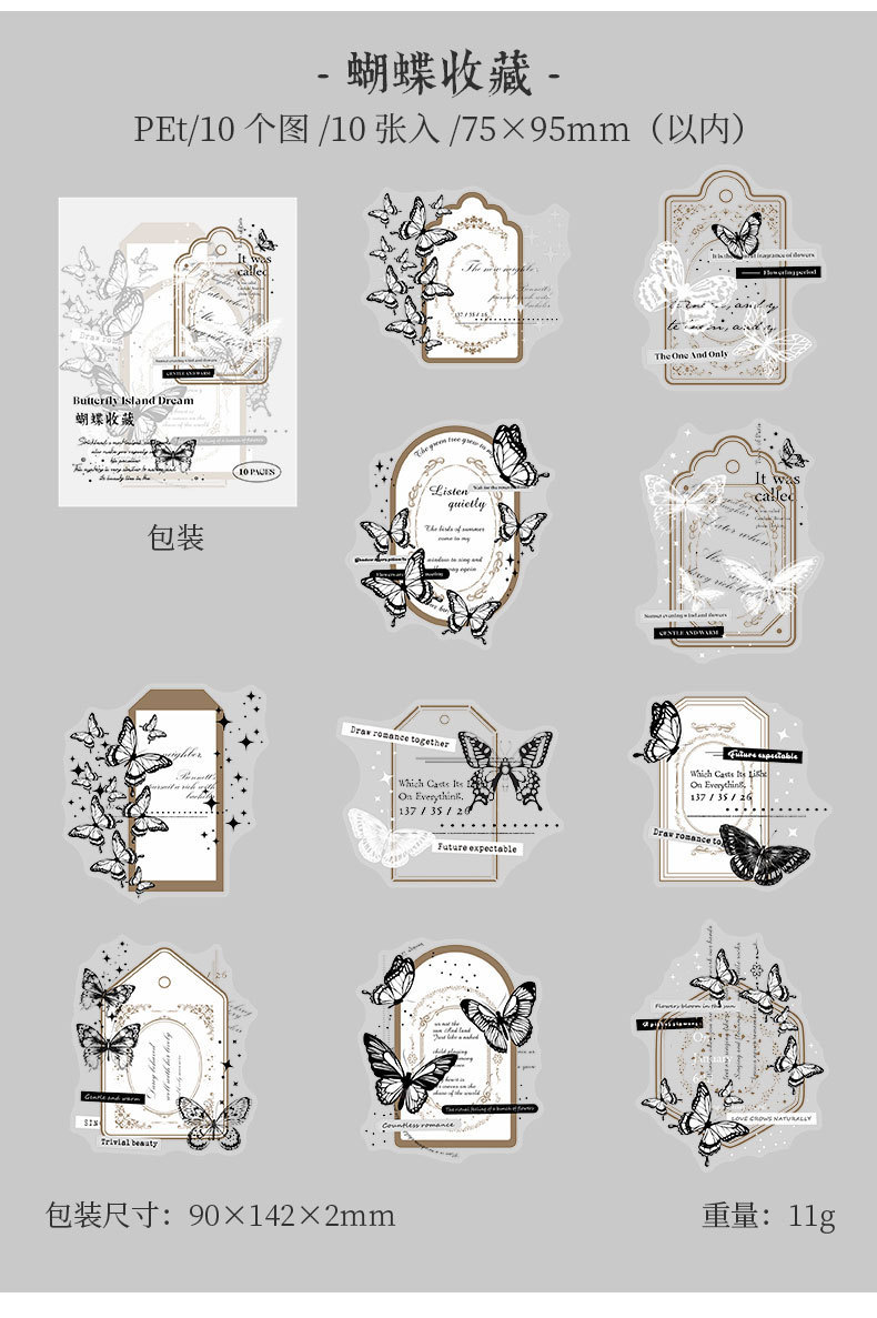 カフェ風 文具 PETシール貼紙 封口貼 アンティーク 手帳素材 蝶 切手 窓 イラスト 幾何学 10枚入