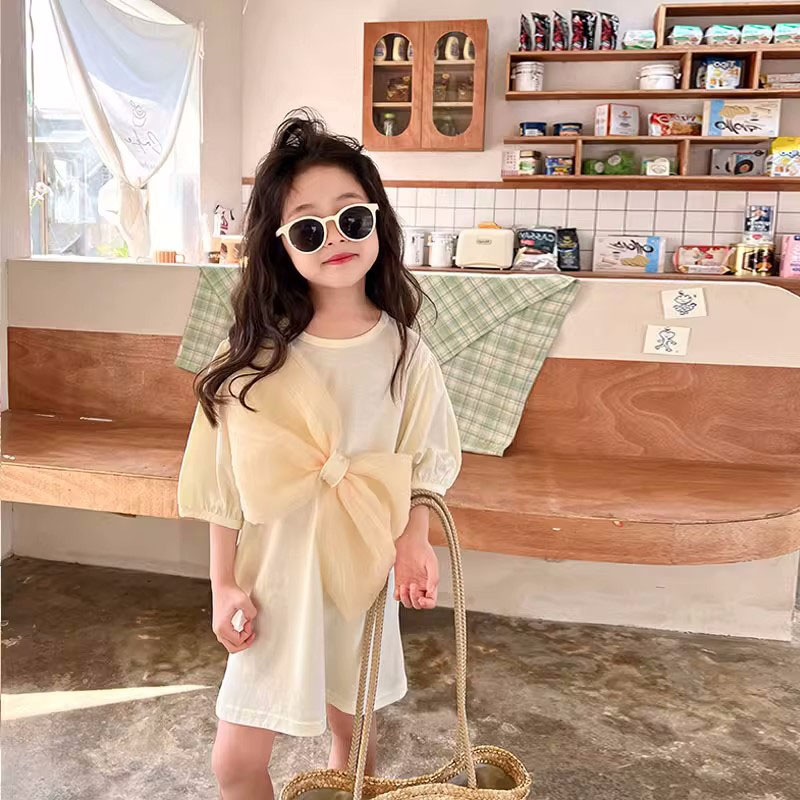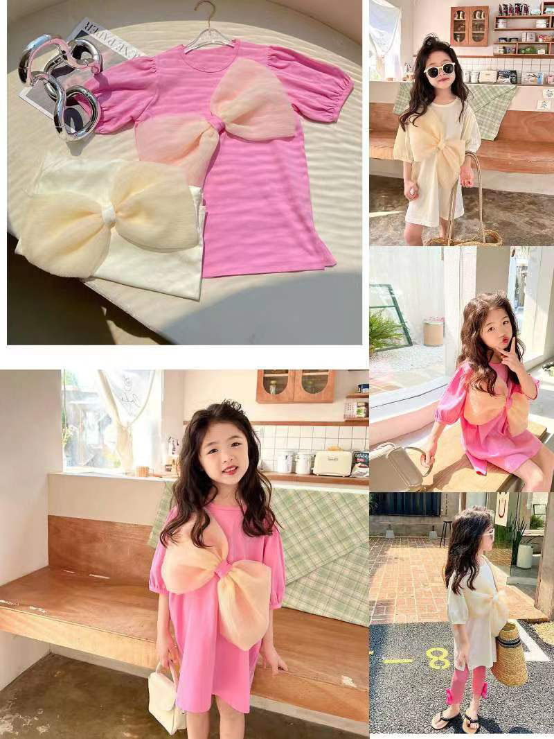 お勧め 春夏新作 韓国風 子供服 3-8歳女の子 半袖ワンピース リボン ワンピ ロングTシャツ 2色 5-13