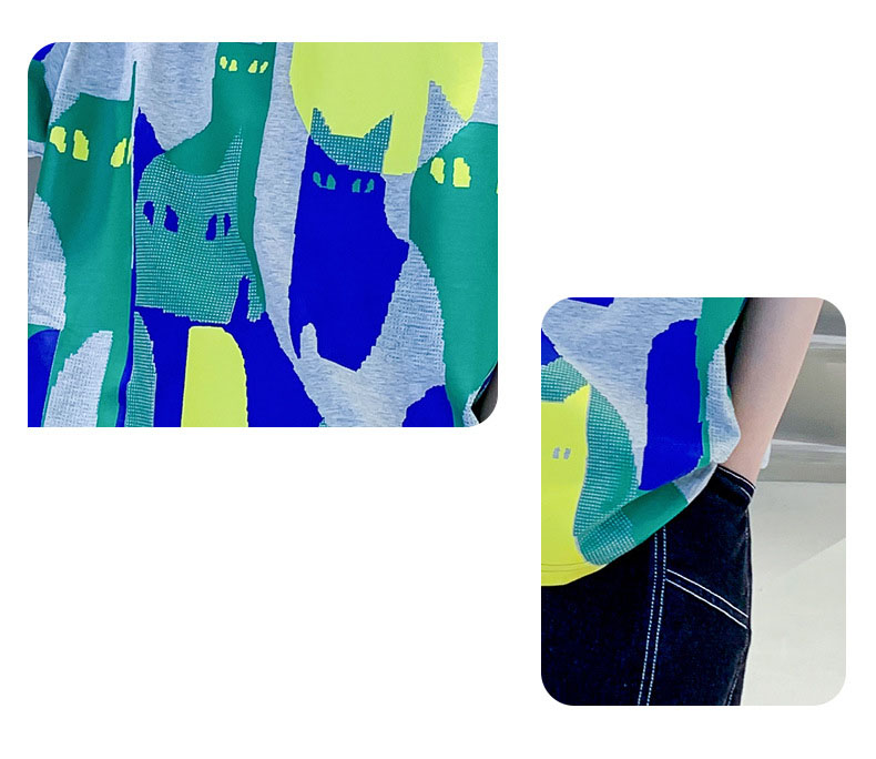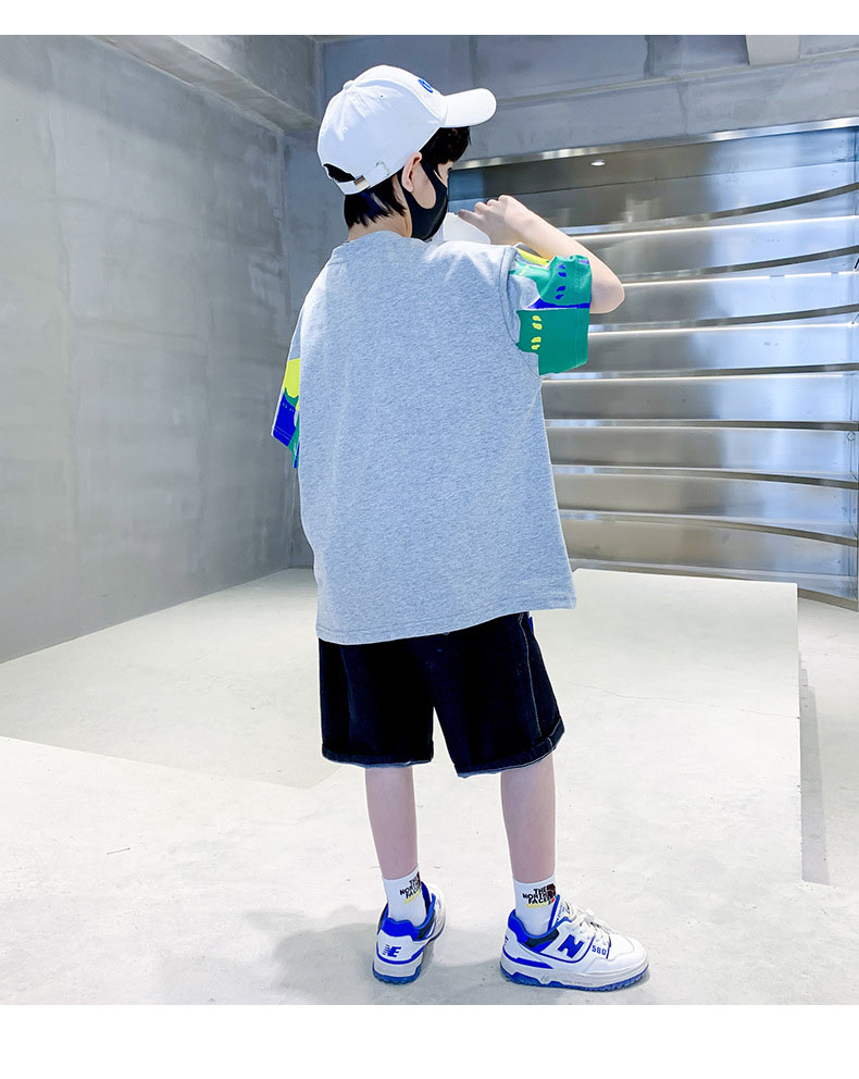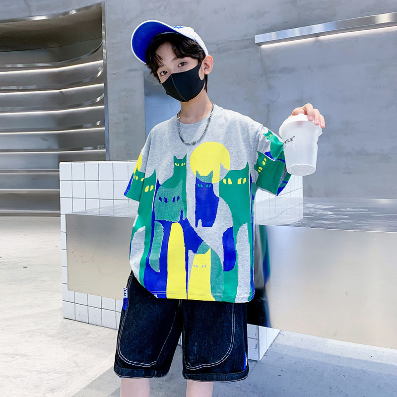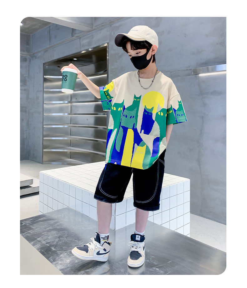 お勧め 春夏新作 男の子 Tシャツ+ハーフパンツ 半袖上着 猫 デニムパンツ 韓国風子供服 120-170 2色
