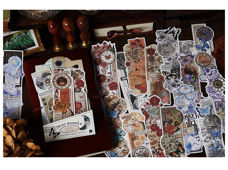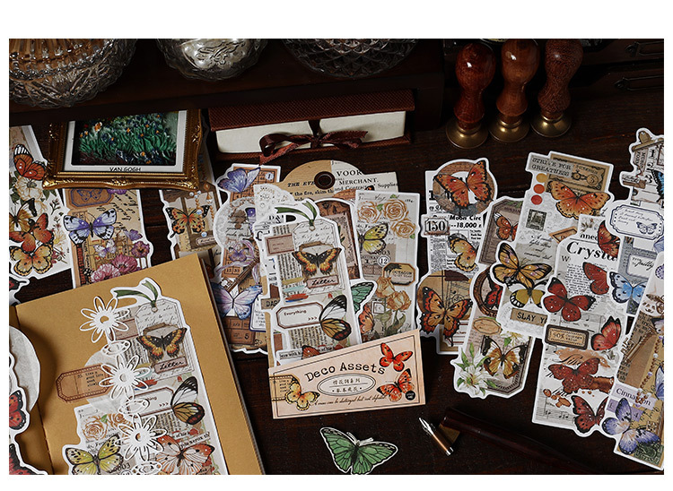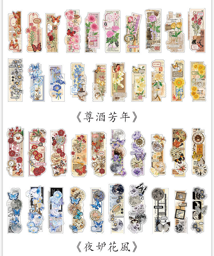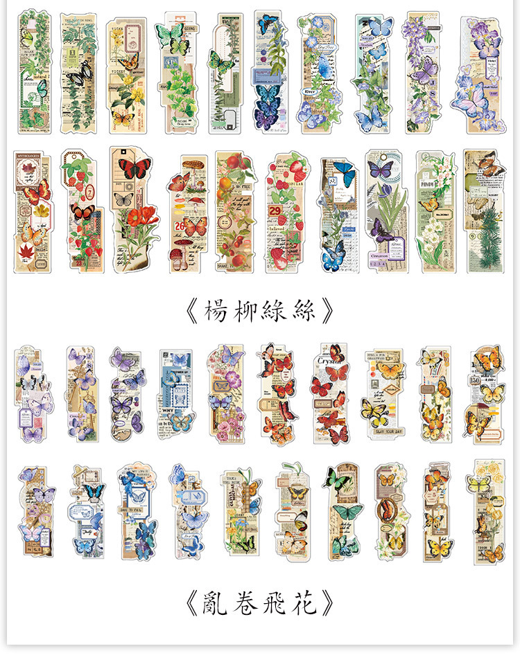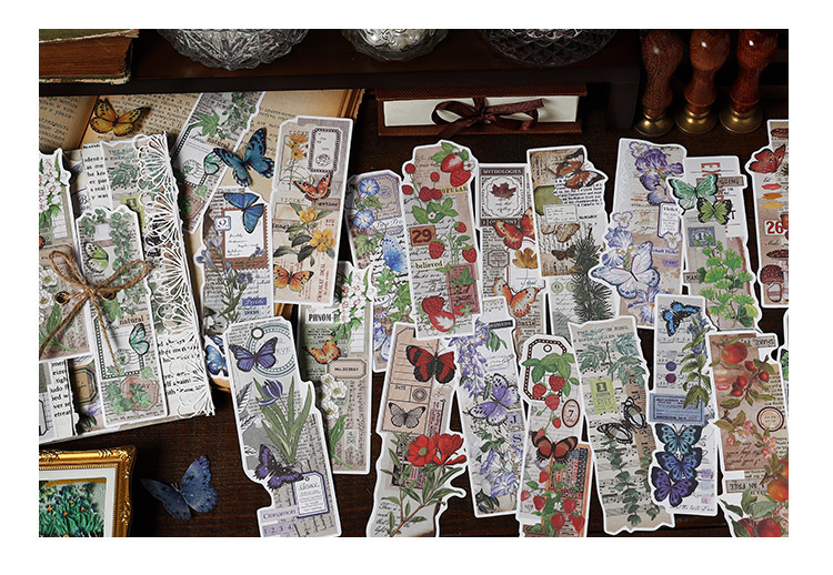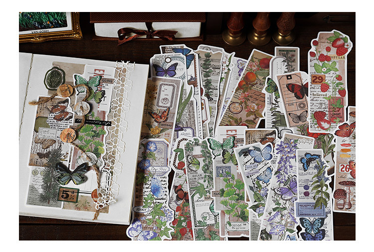 文具 手帳素材 アンティーク 春日 植物花葉蝶キノコ 幾何学ラベル メモ紙素材紙 イラスト 20枚入