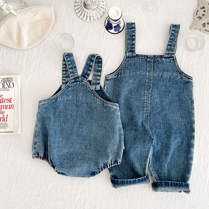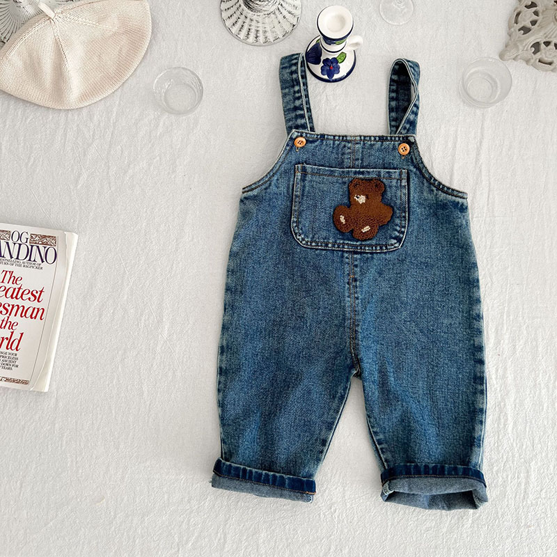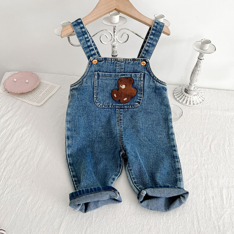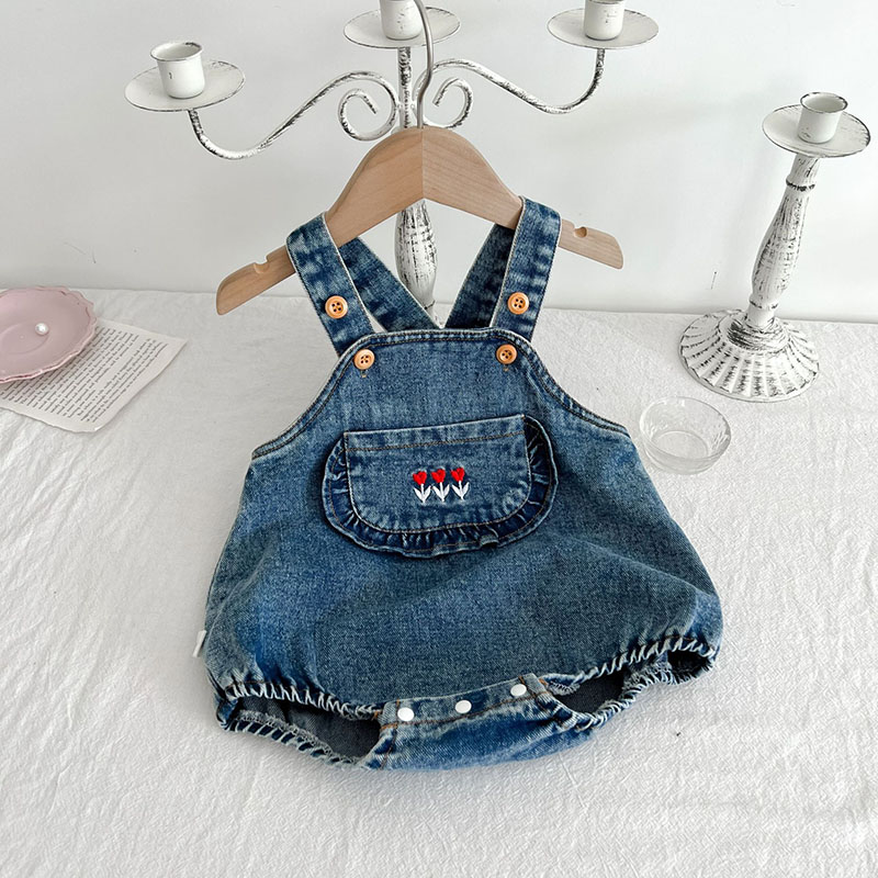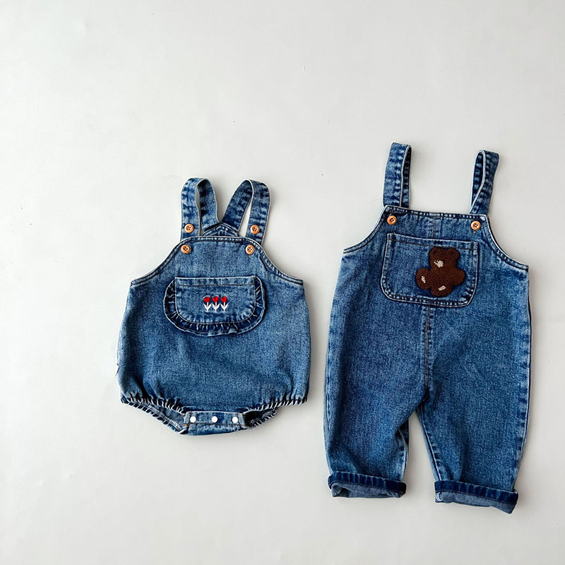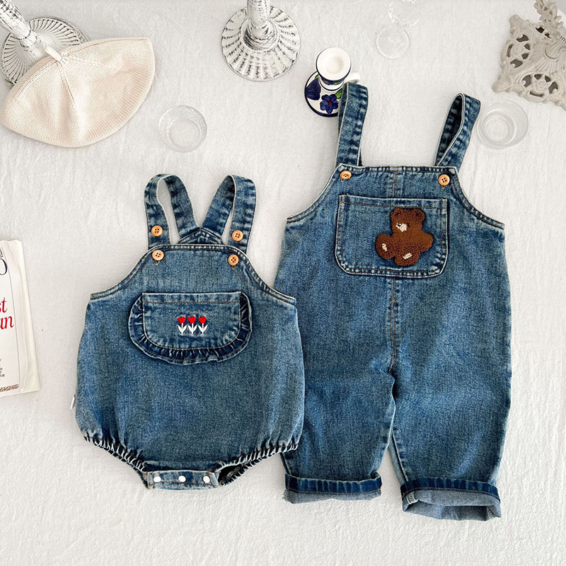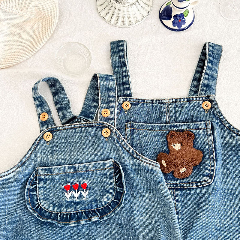 お勧め 春夏 男女子供服 デニム 花柄熊 袖なし連体服 ロンパース 連体ズボン サロペット パンツ 66-100