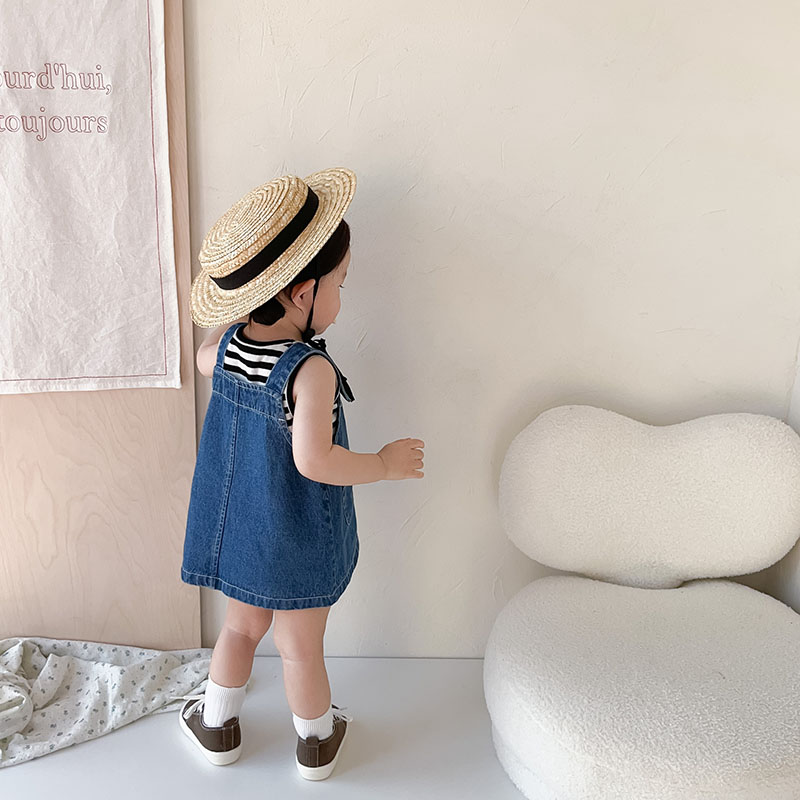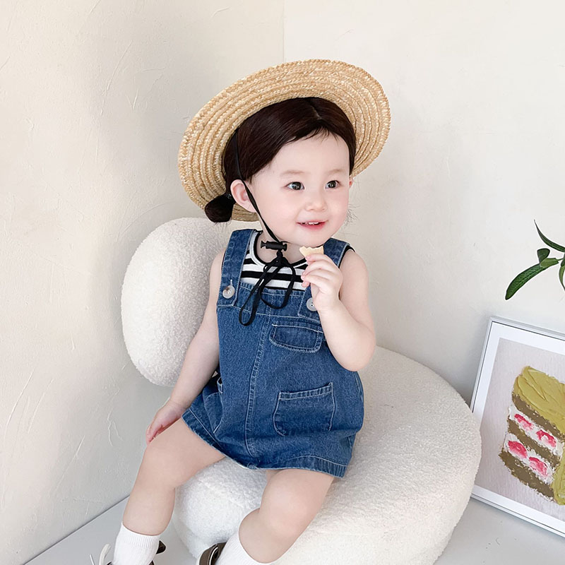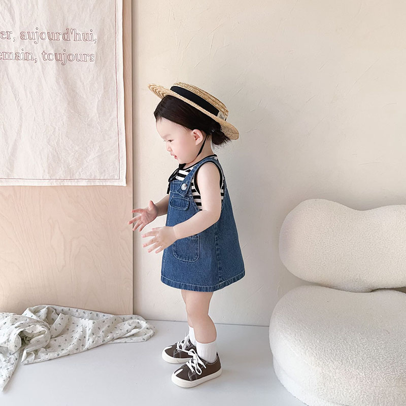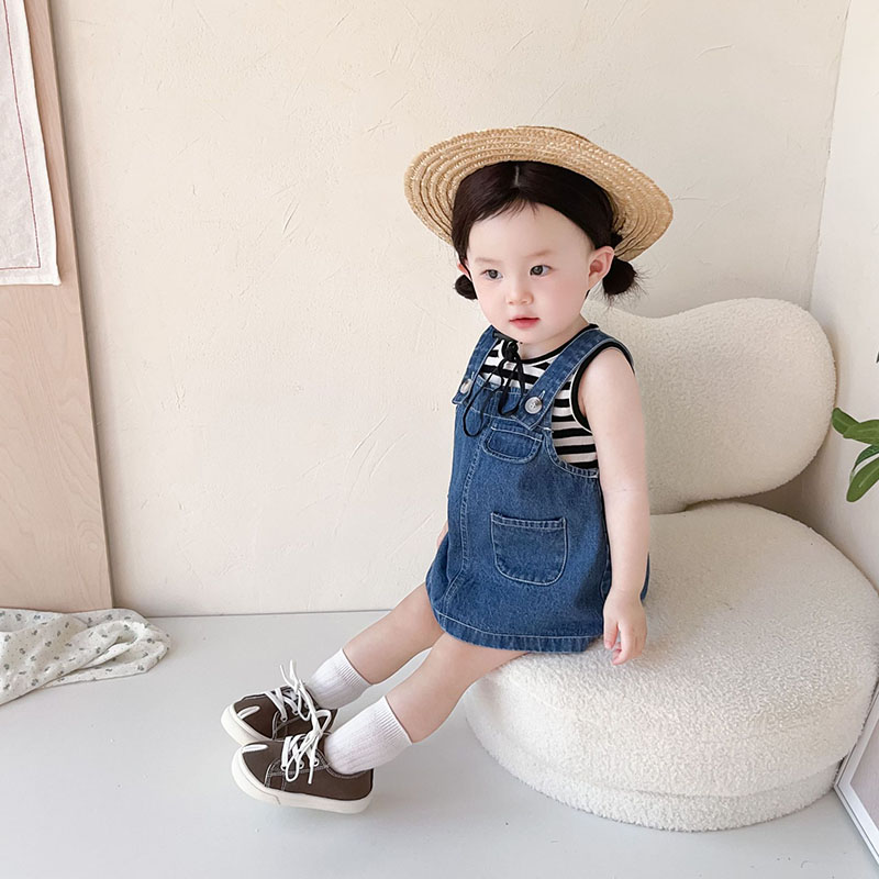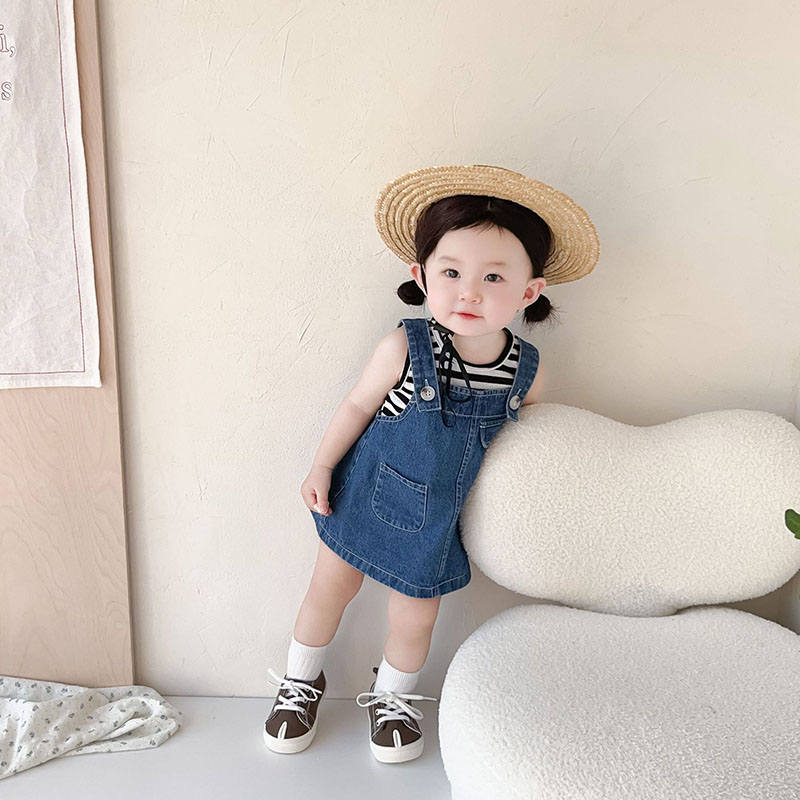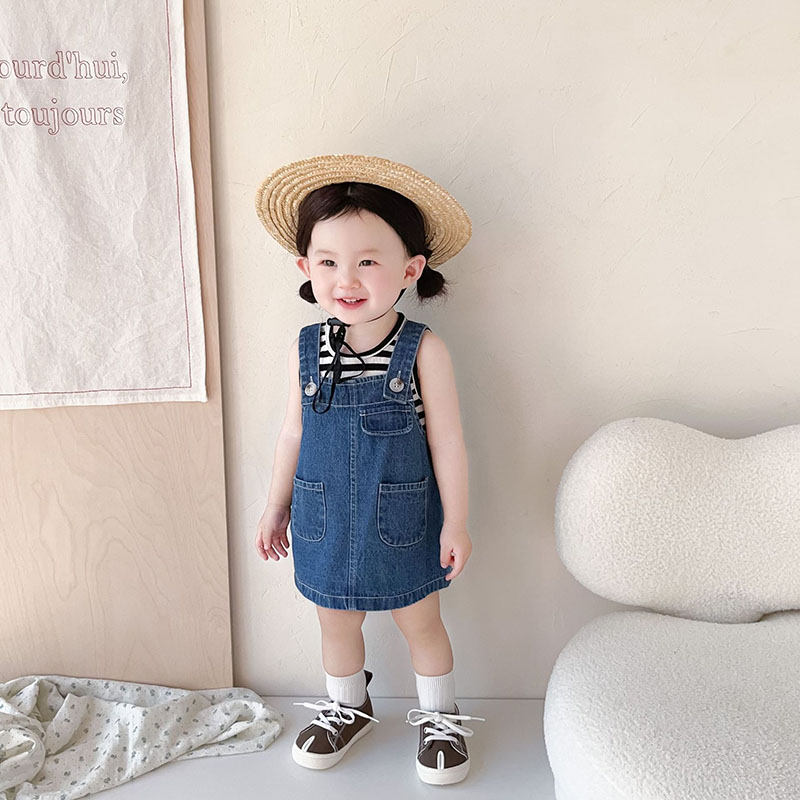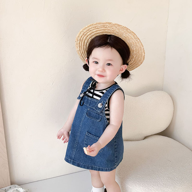 お勧め 春夏新作 子供服 女の子 ボーダー柄 袖なし上着 Tシャツ+吊りスカート デニムスカート 73-110