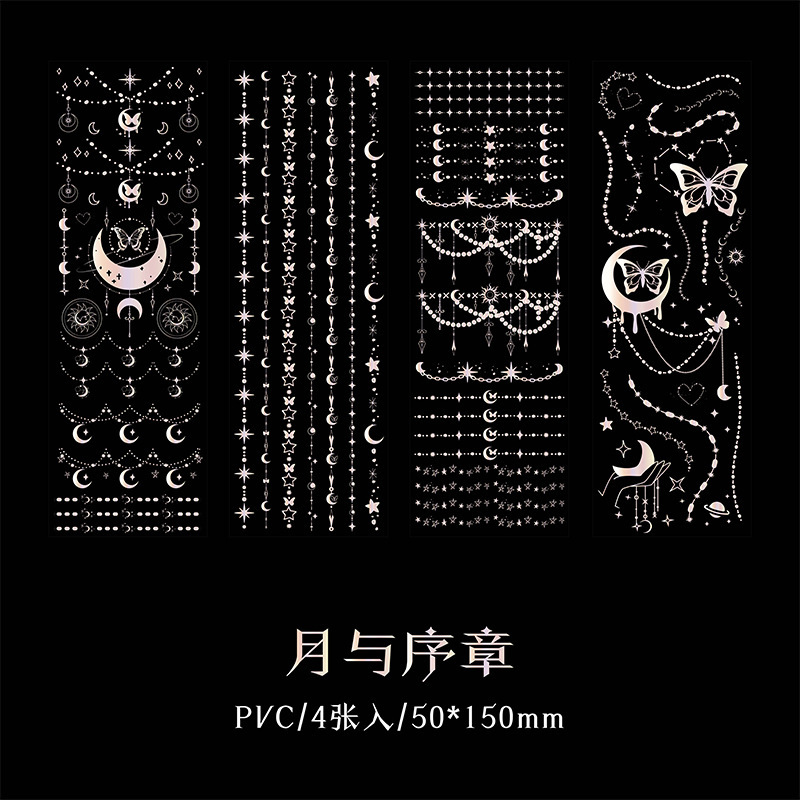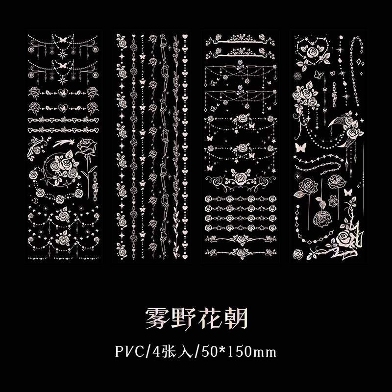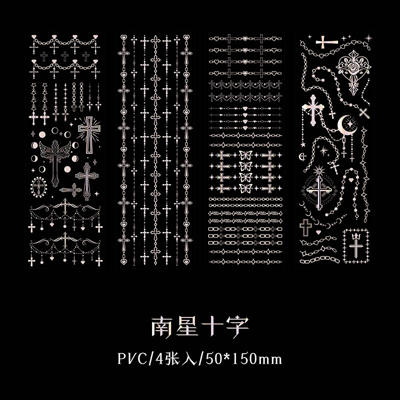 春夏 文具 PVCシール貼紙 手帳素材 封口貼 幾何学 チェーン 蝶 星月薔薇 アンティーク リボン十字架 4枚入