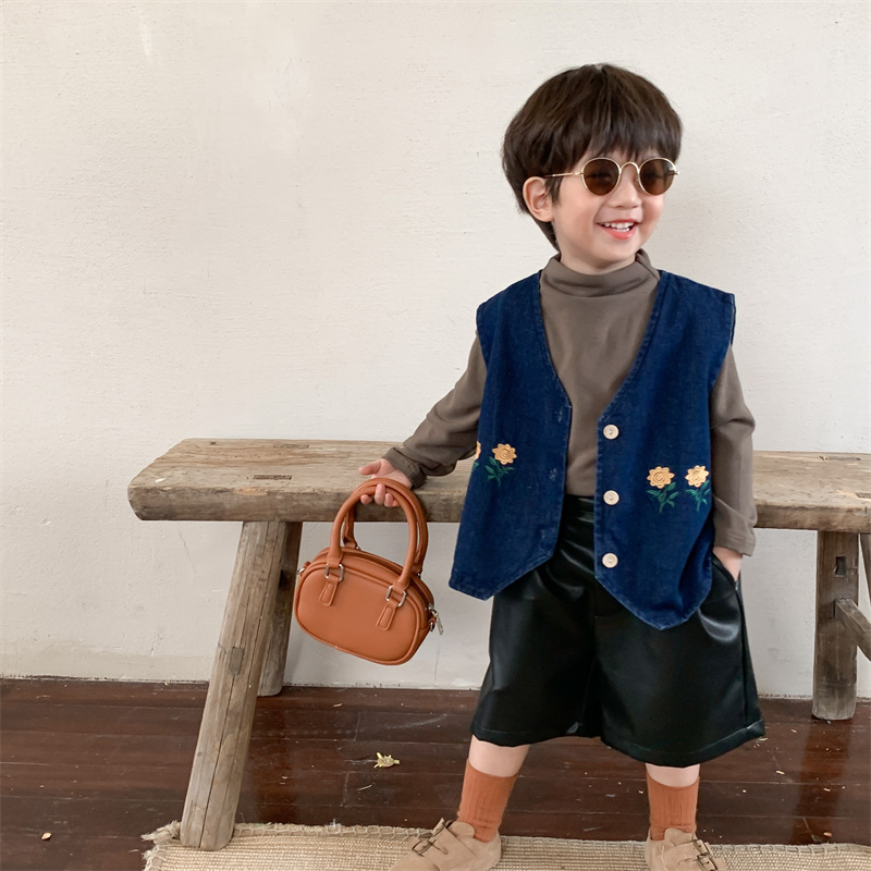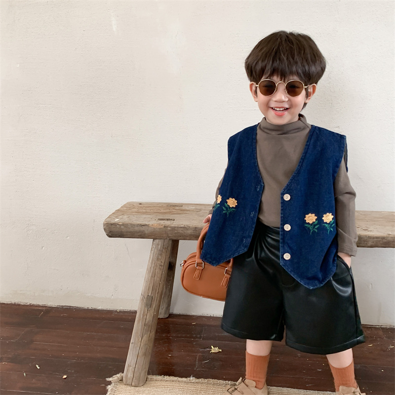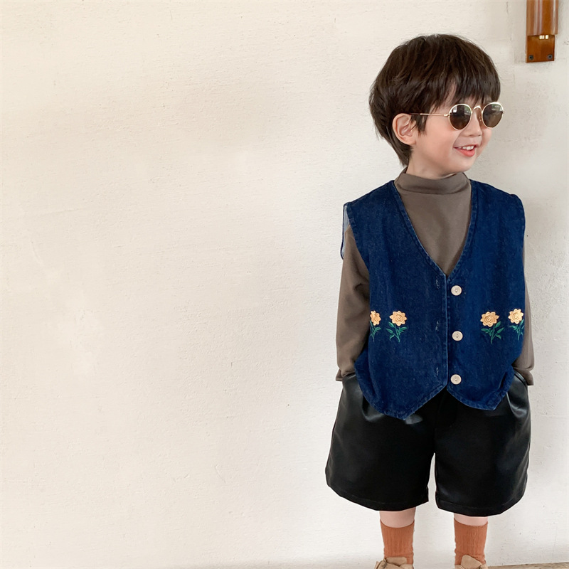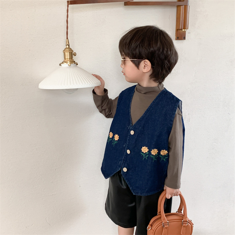 キッズ お勧め 春夏新作 古着系子供服男女 花柄刺繍 デニム 袖なし上着 ベスト チョッキ 80-130