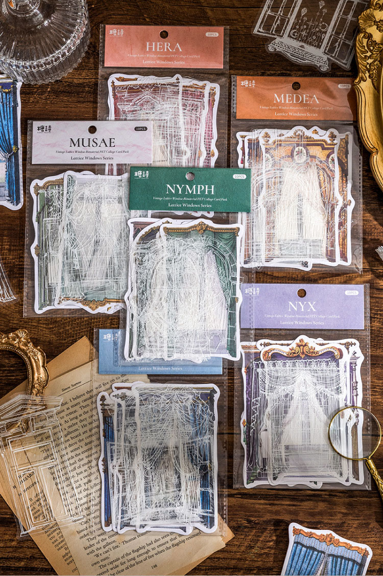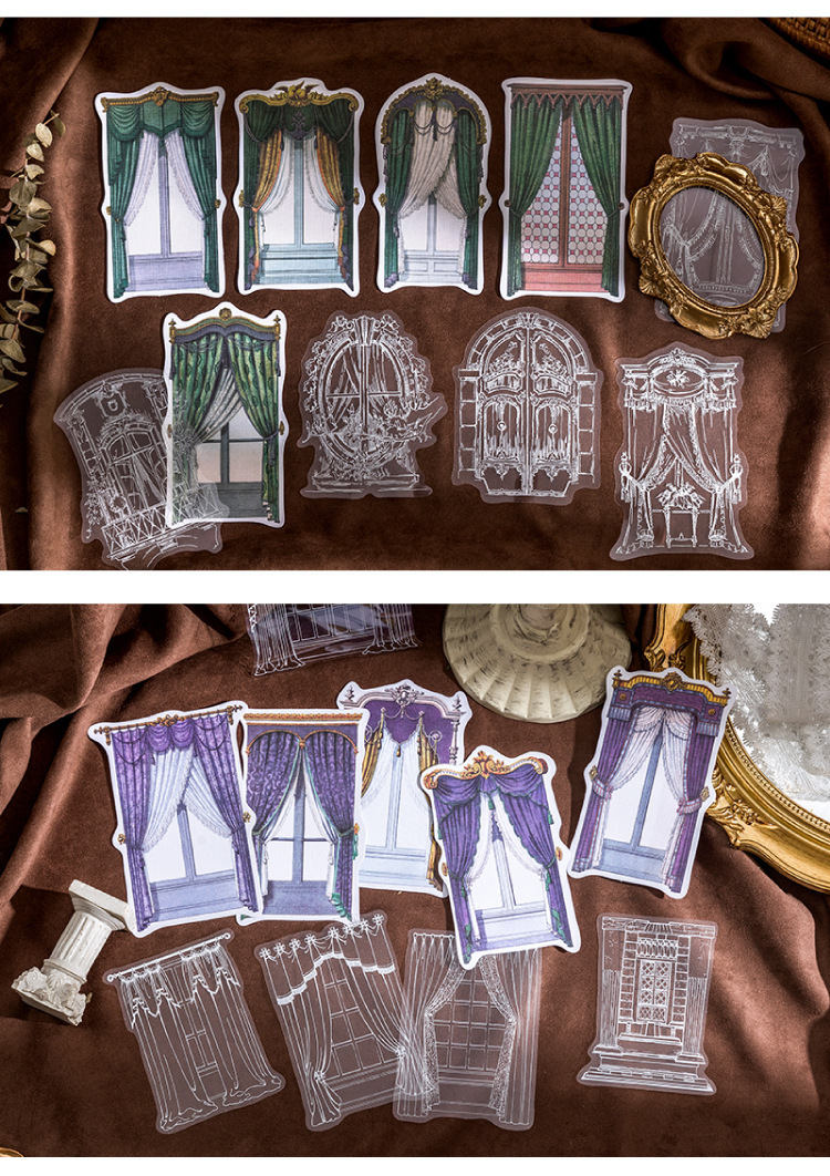 文具 PET+紙 シール貼紙 手帳素材 アンティーク 幾何学ラベル 窓カーテン 封口貼 花柄 レース 10枚入