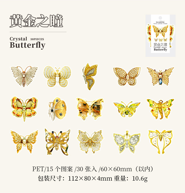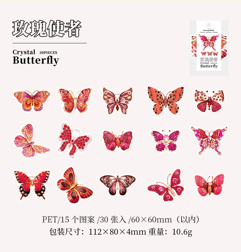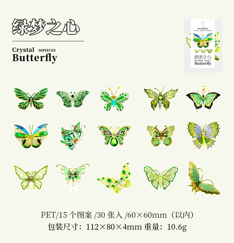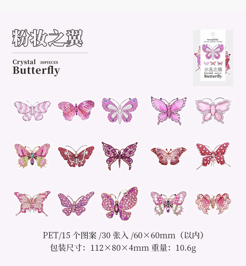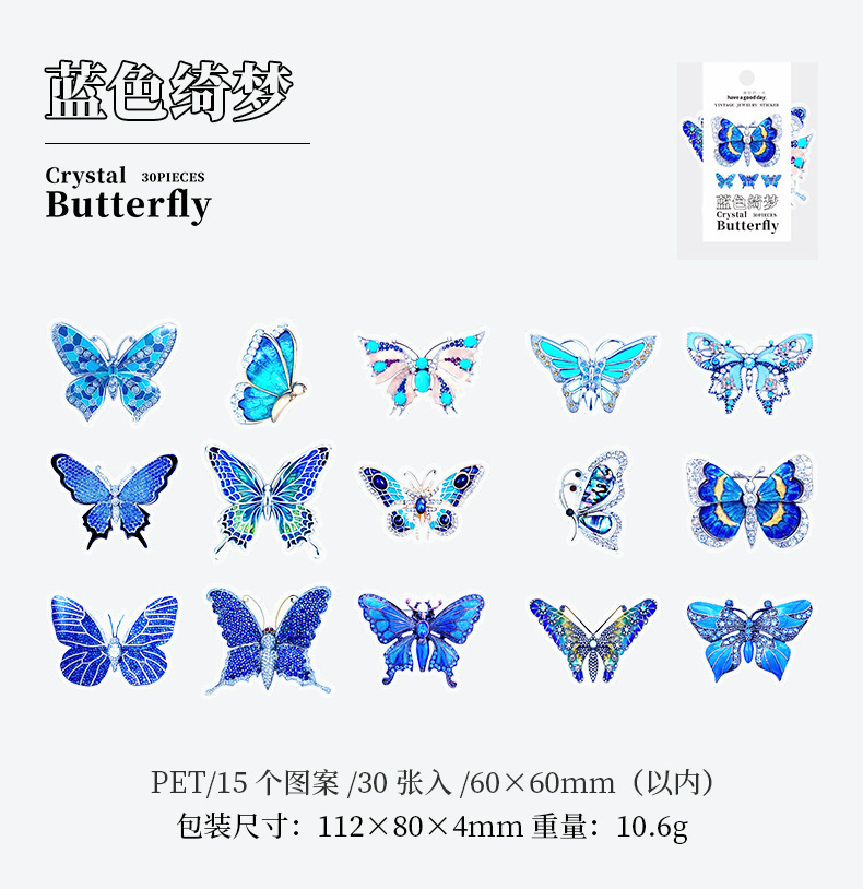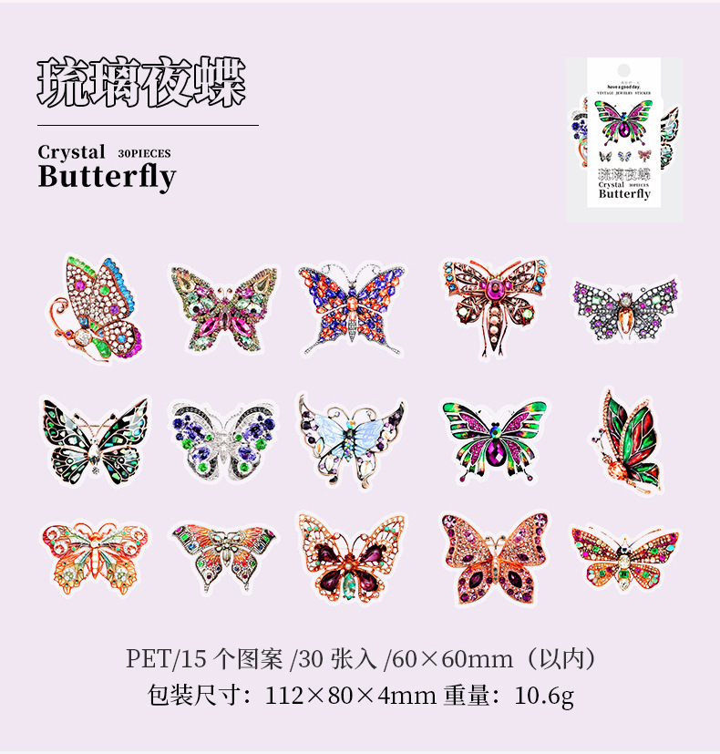 文具 PETシール貼紙 封口貼 アンティーク 手帳素材 春新作 キラキラ 蝶バタフライ図鑑 イラスト 30枚入