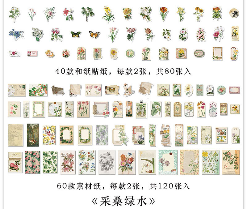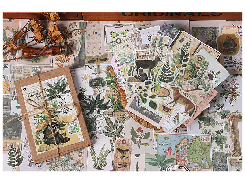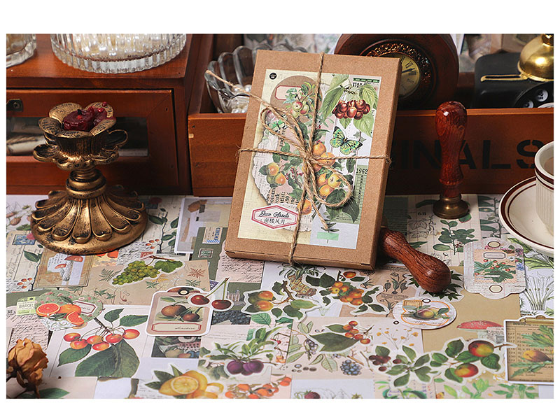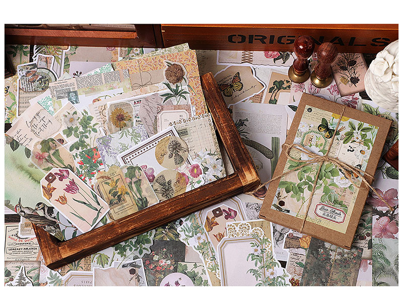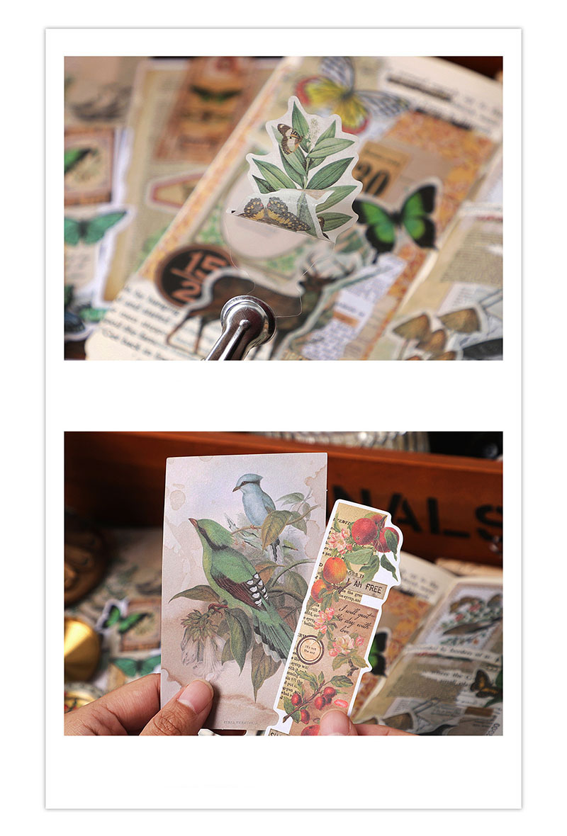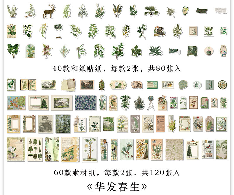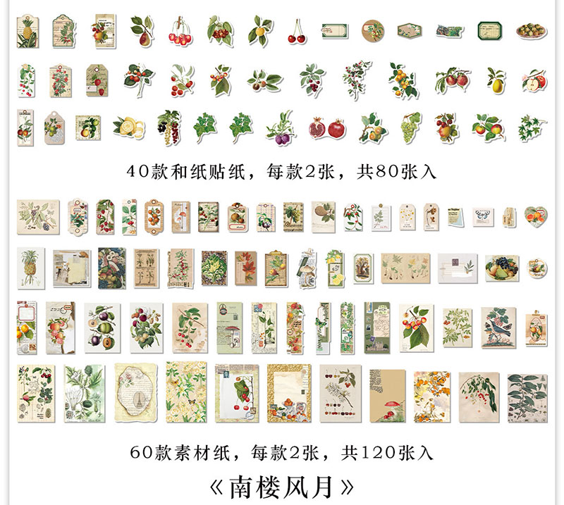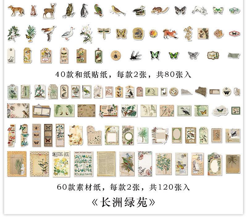 ステッカー シール アンティーク アニマル フルーツ 植物花葉 イラスト ラベル 貼紙80枚+素材紙120枚