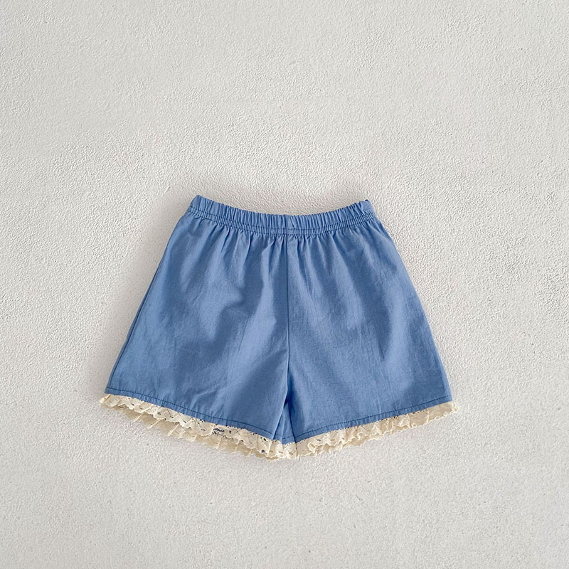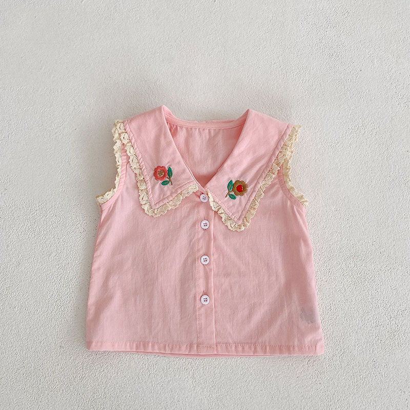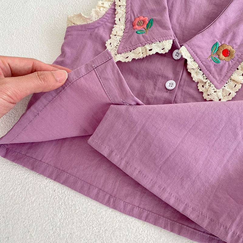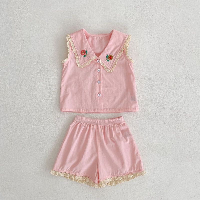 女の子春夏新作 フリル ブラウス ノースリープ上着 花柄刺繍 ショートパンツ シャツ+ズボン 73-110