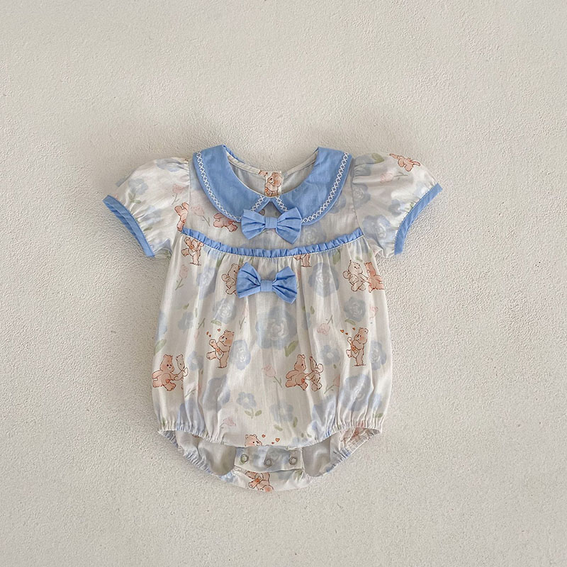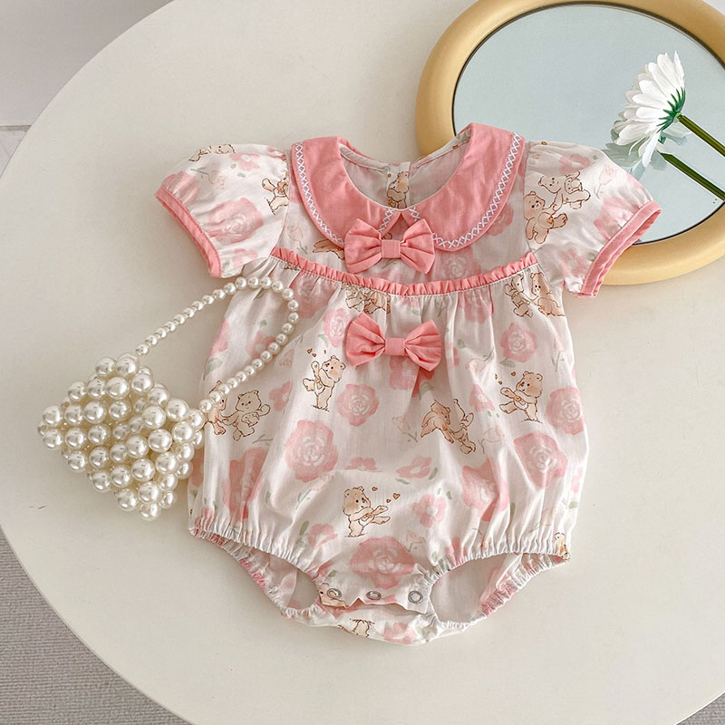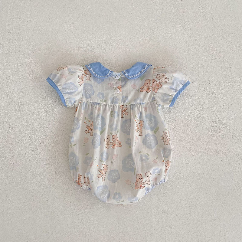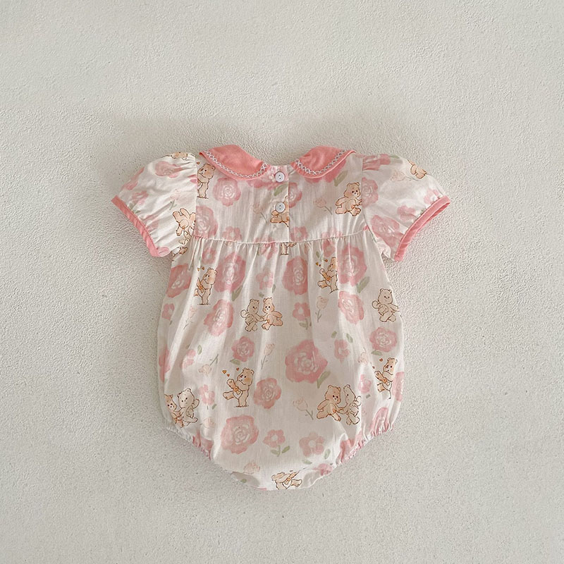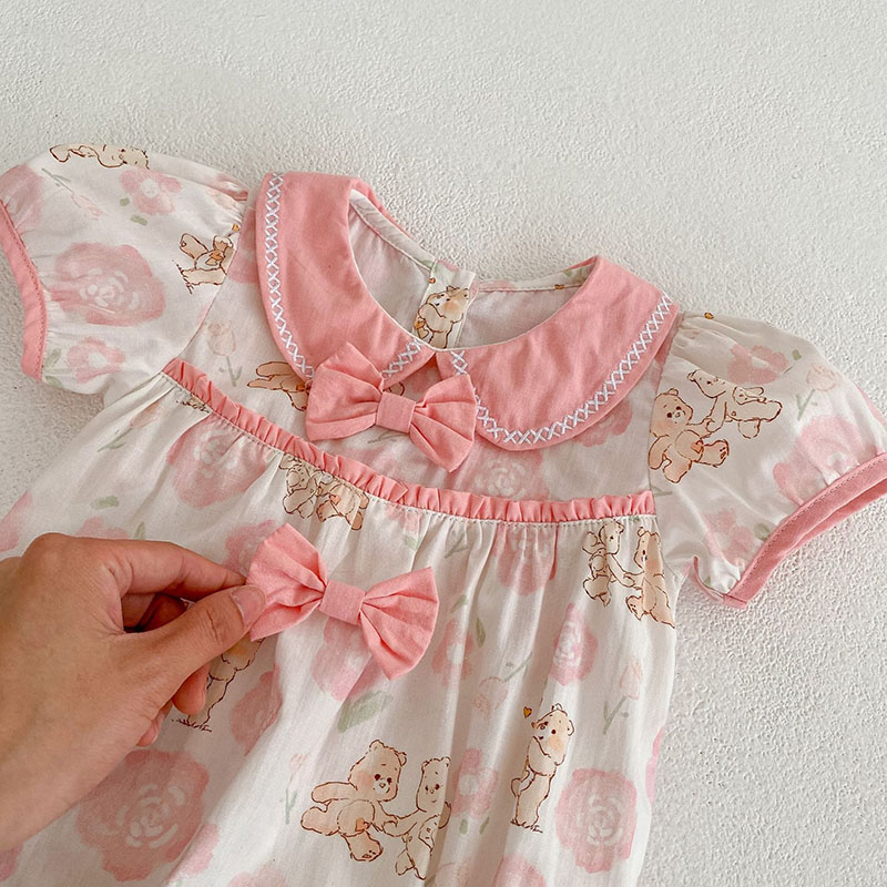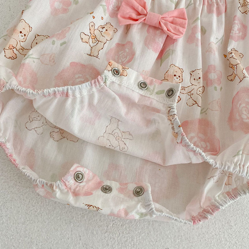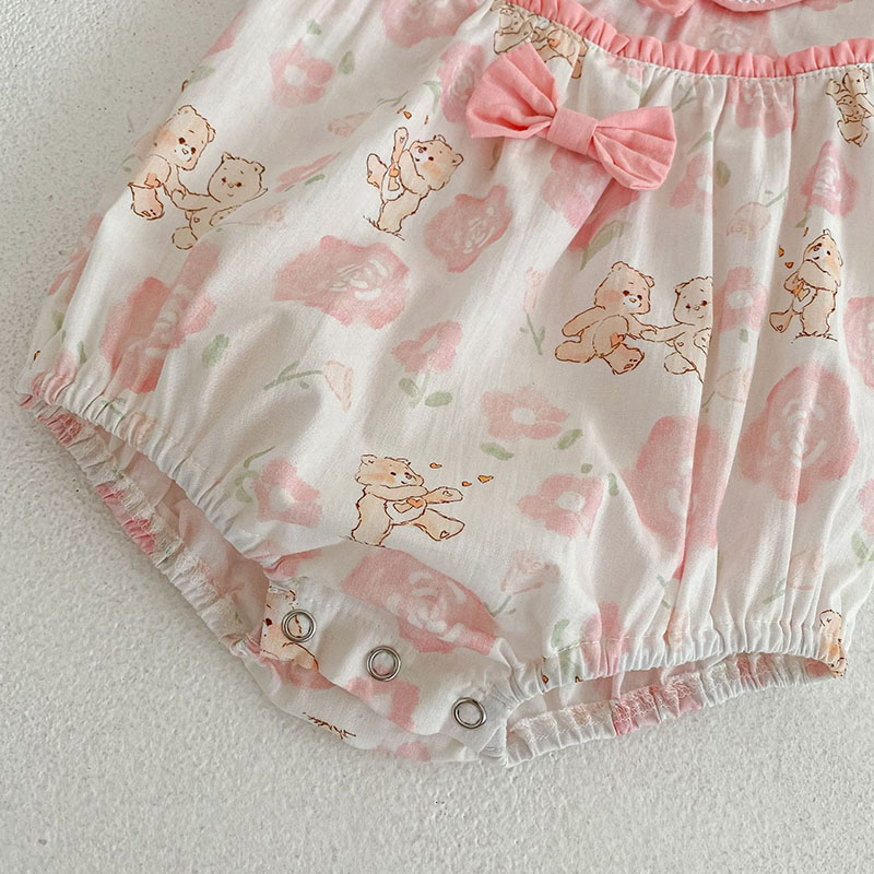 夏新作 ベビー ガールズ 連体服 花柄 ボタニカル フリル リボン 熊 ロンパース カバーオール 66-90