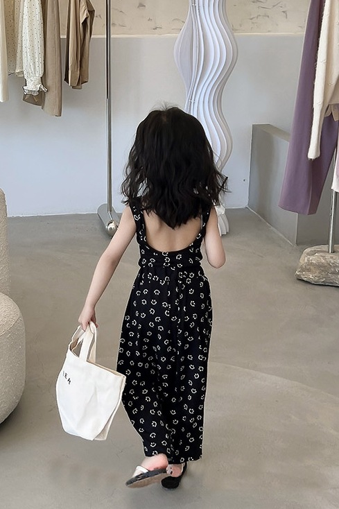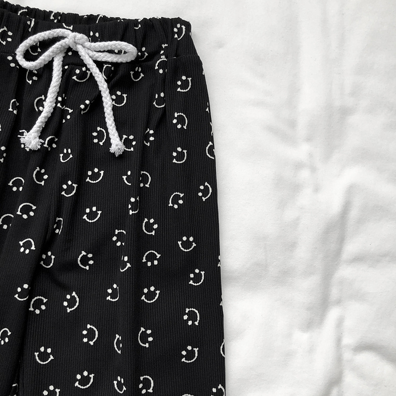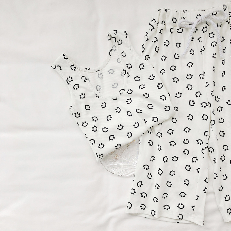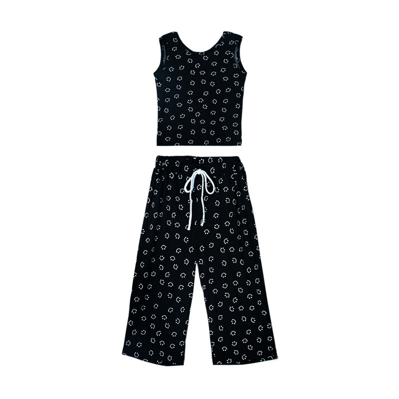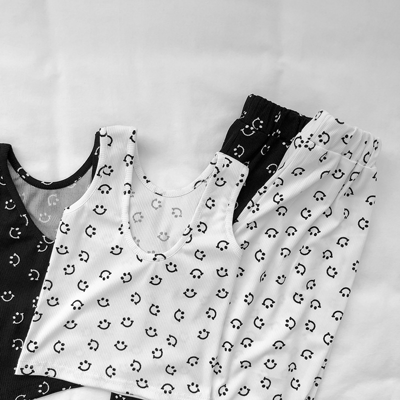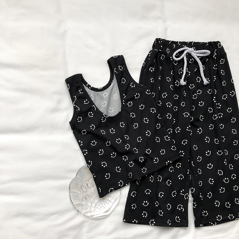 サマー キッズ ガールズ スマイル Uネック ブラウス ワイドパンツ ノースリープ シャツ+パンツ 90-140