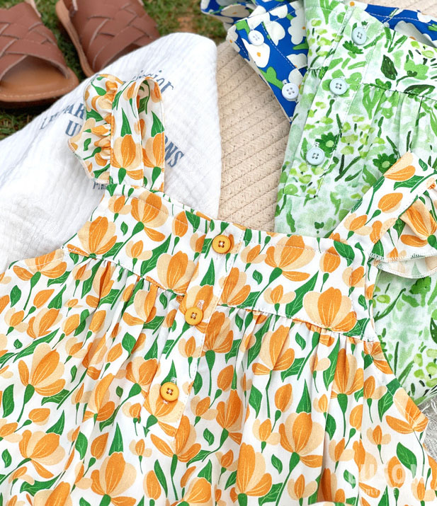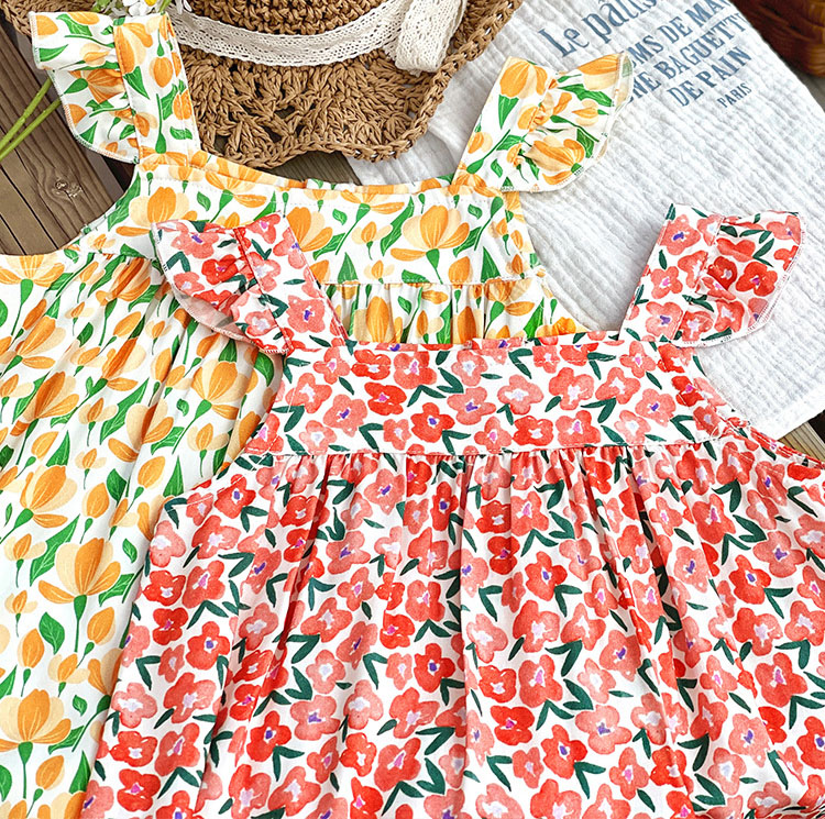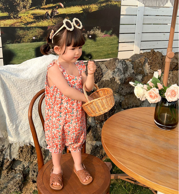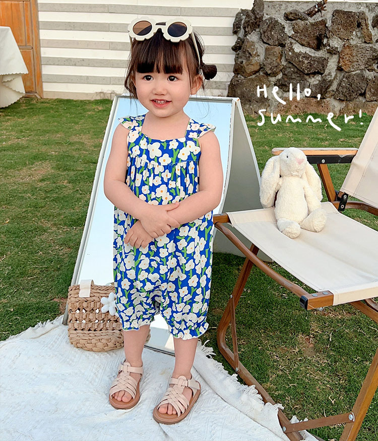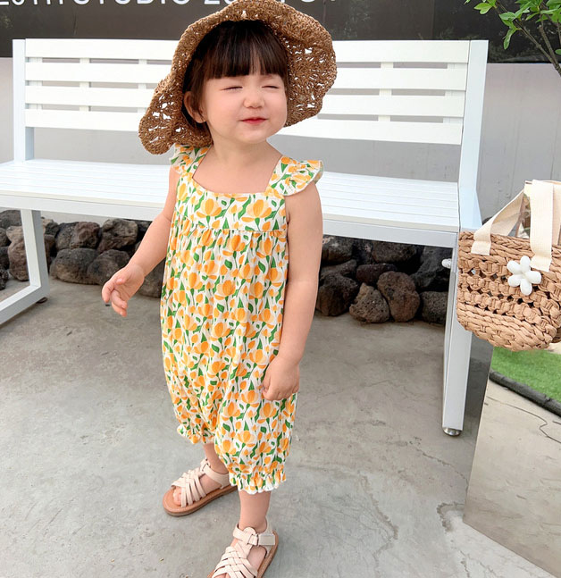 ガールズ サマー キッズ ジャンプスーツ ノースリープ ボタニカル ワイドパンツ サスペンダー 90-140