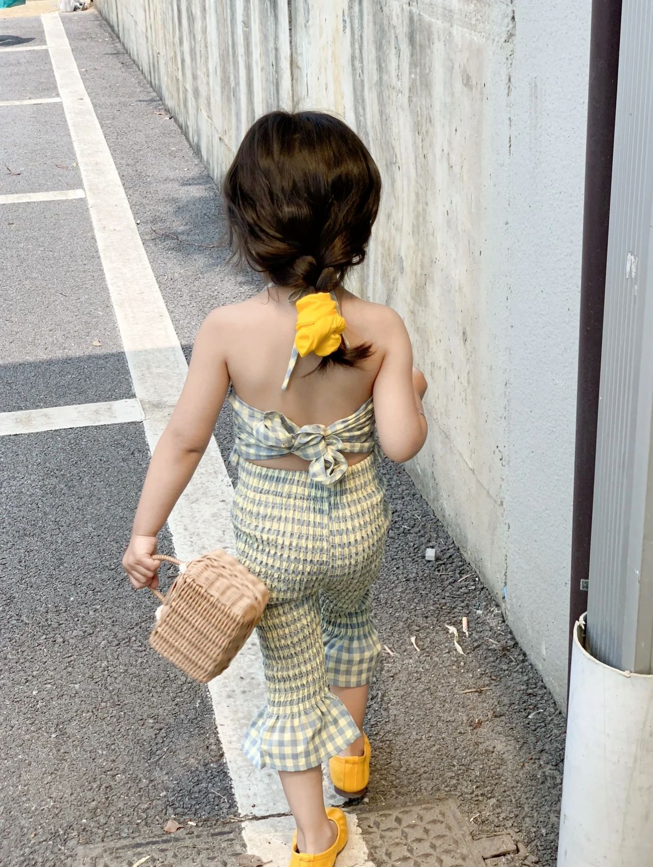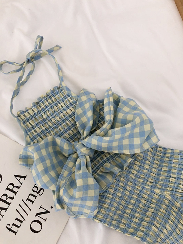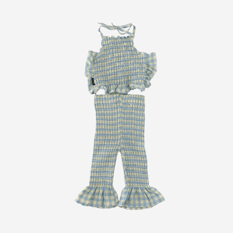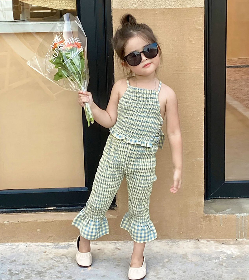 お勧め 春夏新作 子供服女の子 リボン チェック柄 キャミソール ベルボトム 袖なし上着+パンツ 90-140