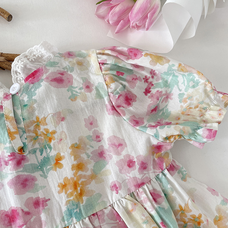 お勧め 春夏新作 韓国風子供服 3-8歳キッズ シフトドレス 花柄 ワンピース レースフリル 半袖ワンピ 90-140