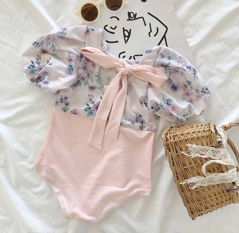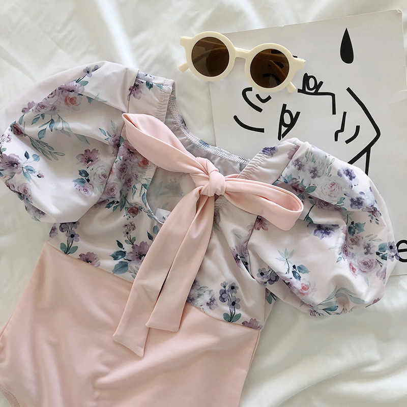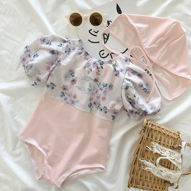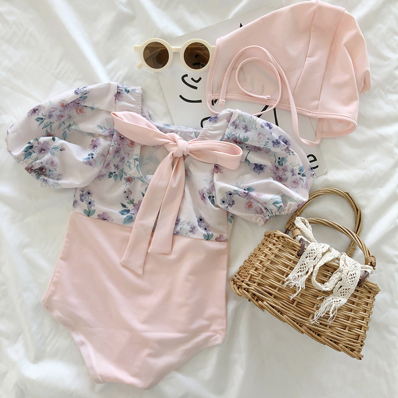お勧め 春夏新作 韓国風子供服 女の子 キッズ 花柄 リボン 帽子+ワンピース水着 連体水泳服 半袖 S-L