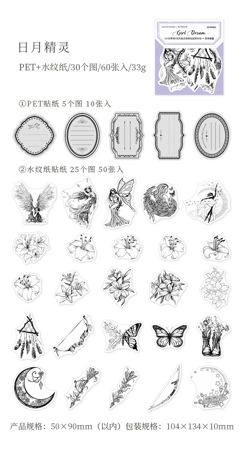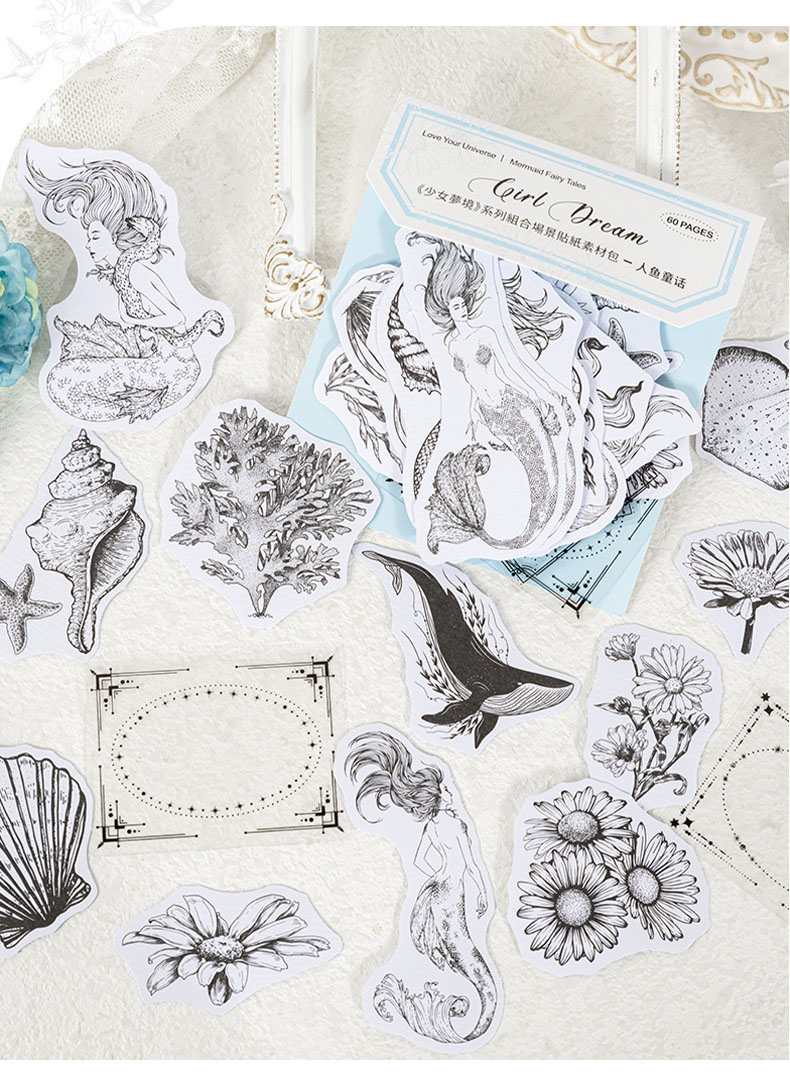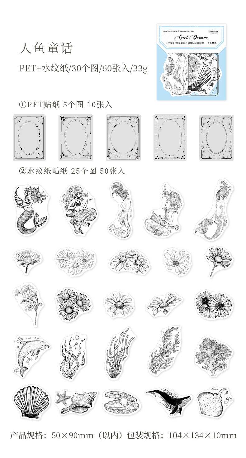 PETステッカー シール 少女 植物花葉蝶キノコ 海洋生物鯨貝殻 猫キャット 人魚姫マーメイド ラベル 60枚入