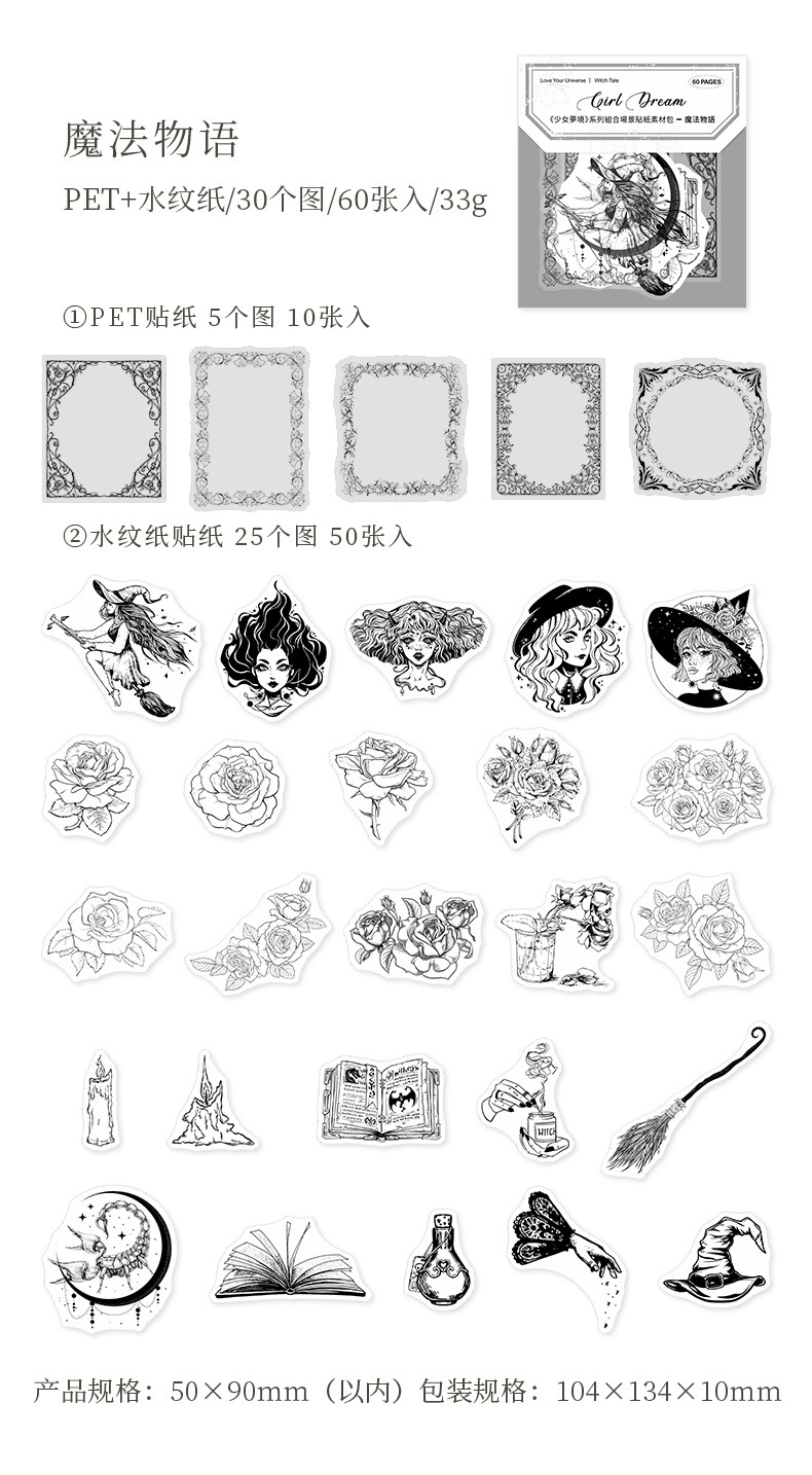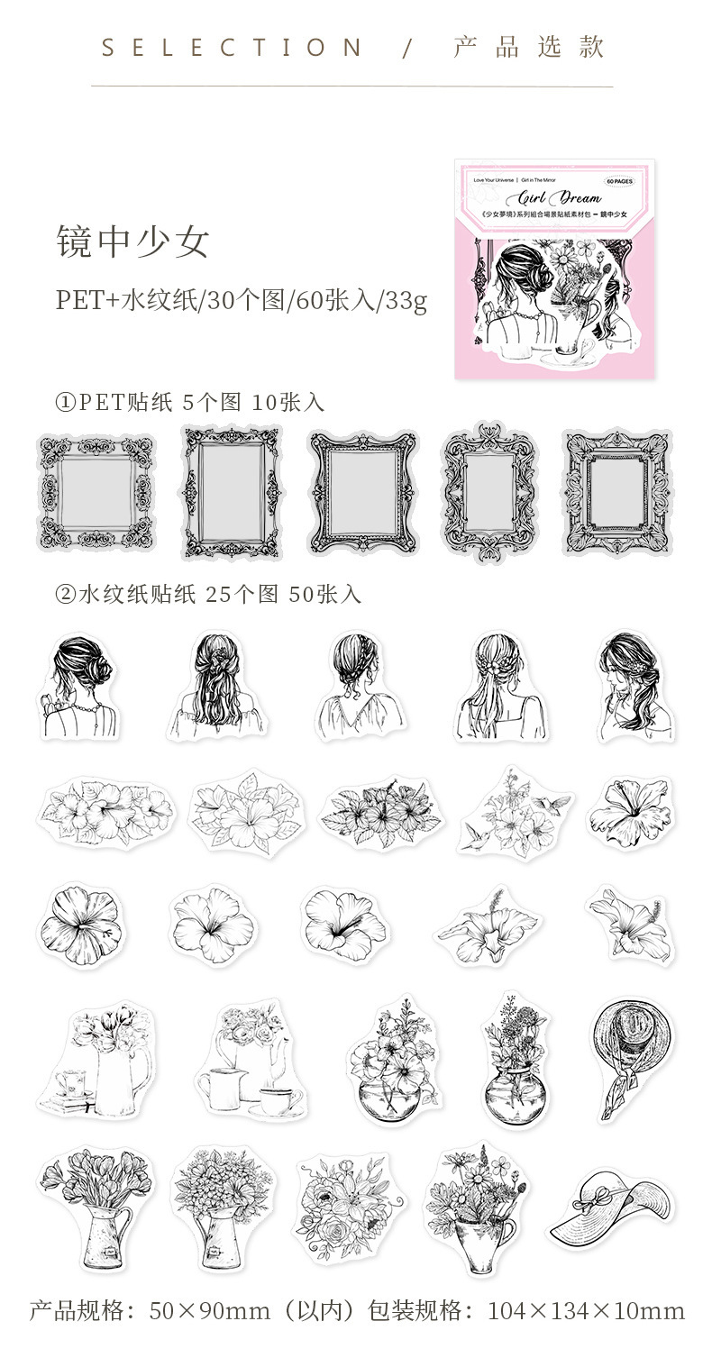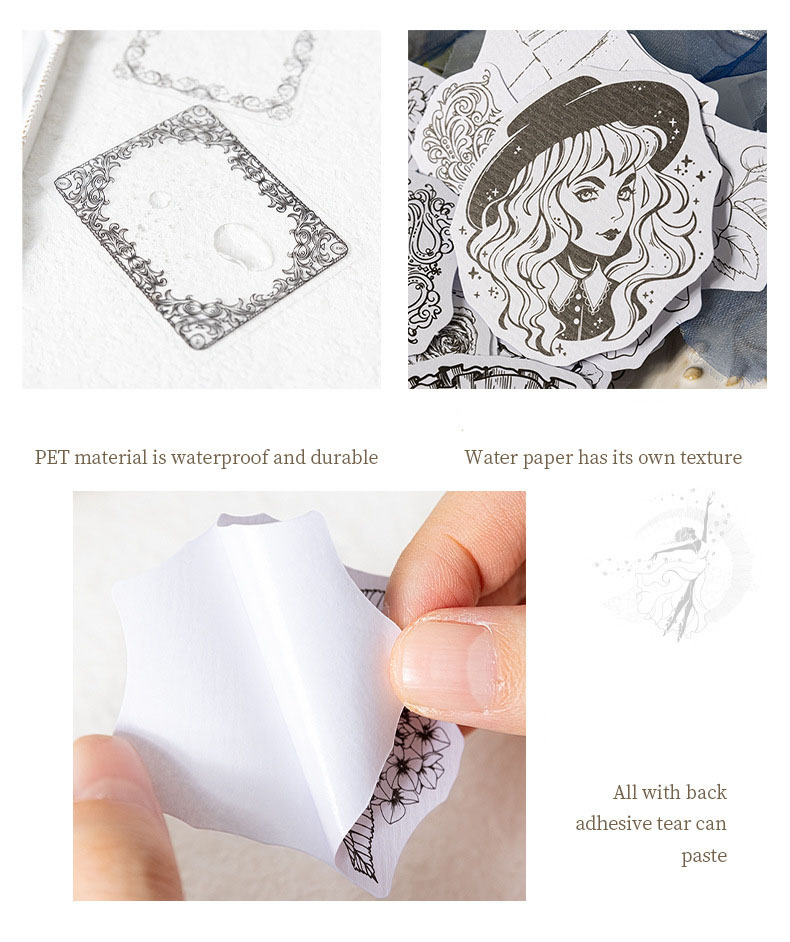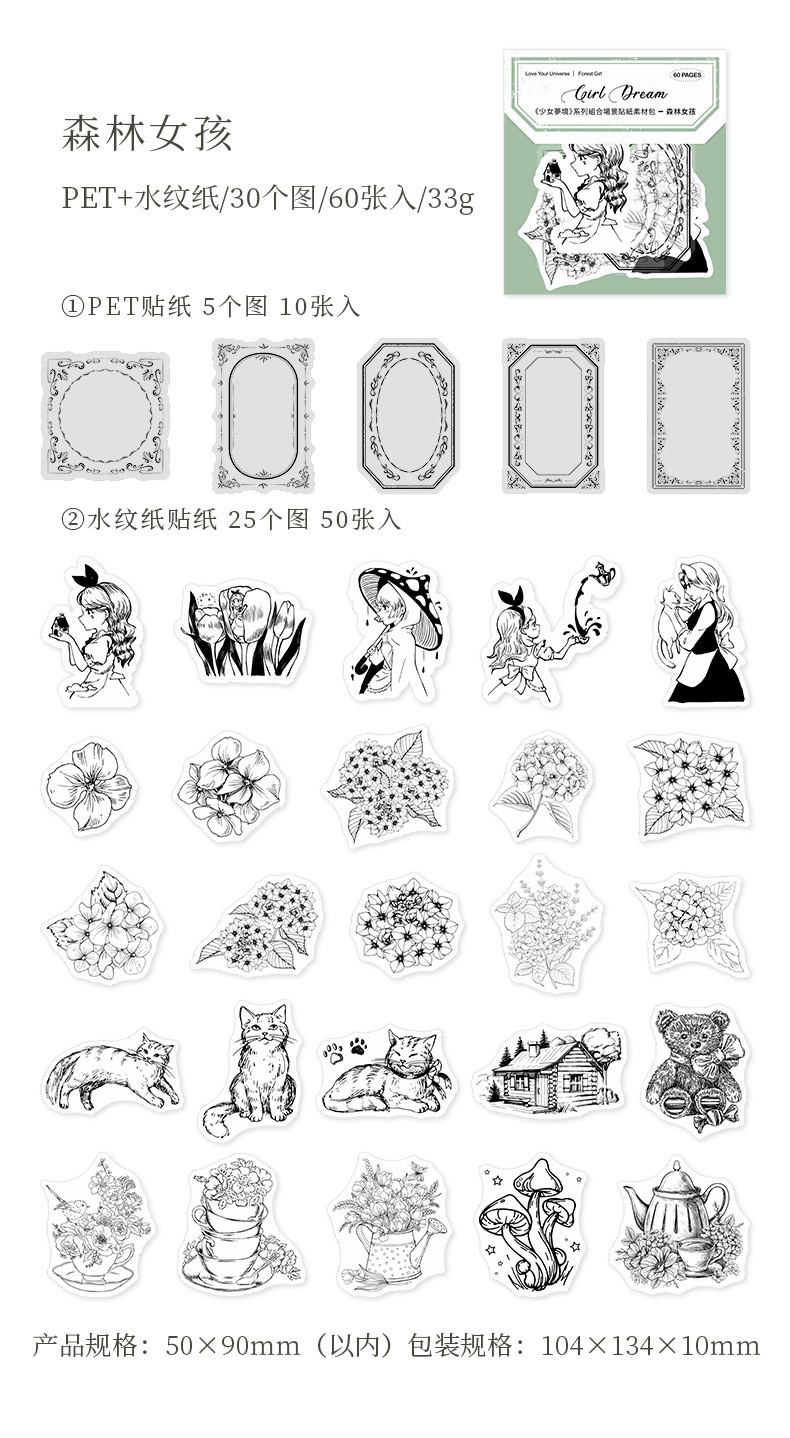 PETステッカー シール 少女 植物花葉蝶キノコ 海洋生物鯨貝殻 猫キャット 人魚姫マーメイド ラベル 60枚入