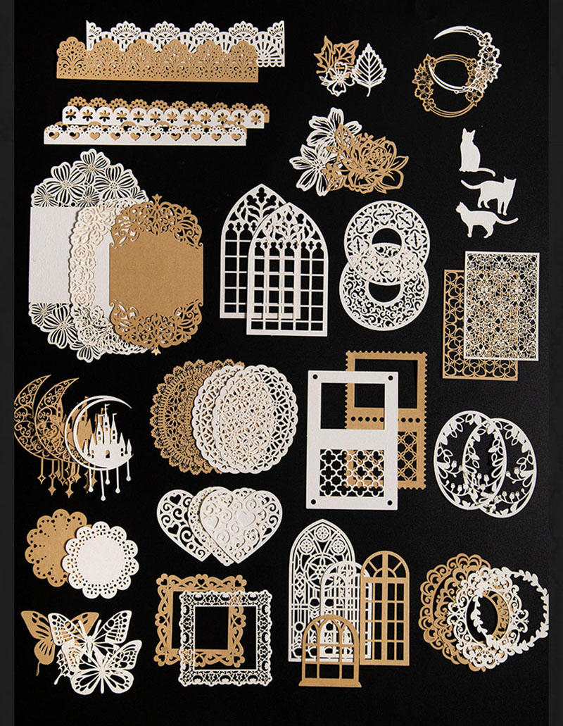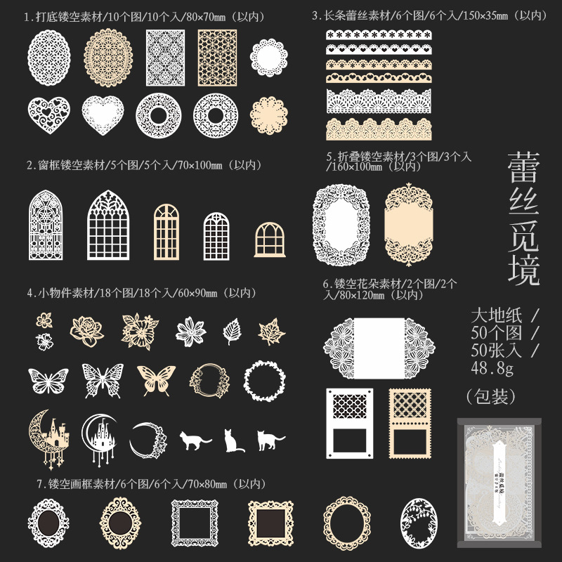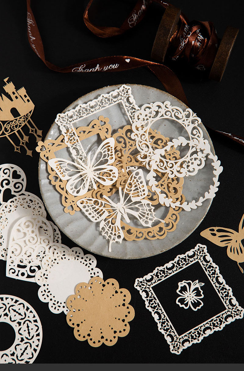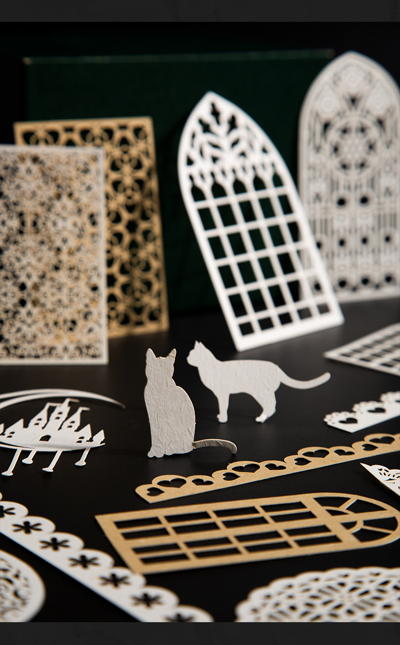 カフェ風 素材紙メモ紙 アンティーク ラベル レース 猫キャット 植物花葉蝶 幾何学 ハート 50枚入
