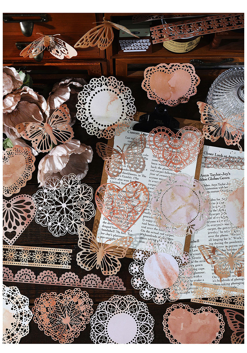 カフェ風 素材紙メモ紙 アンティーク ラベル 植物花葉 花柄レース ハート バタフライ イラスト 10枚入