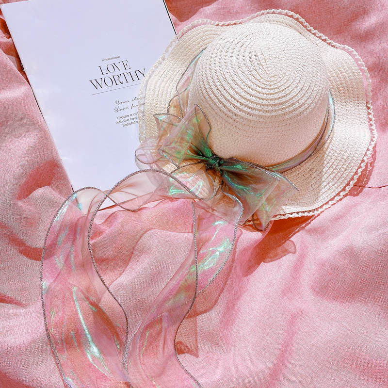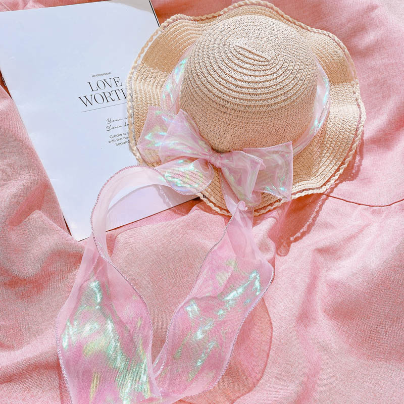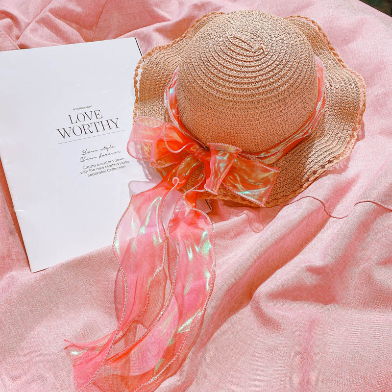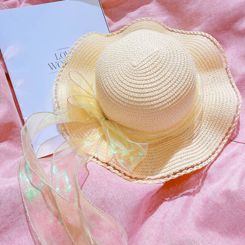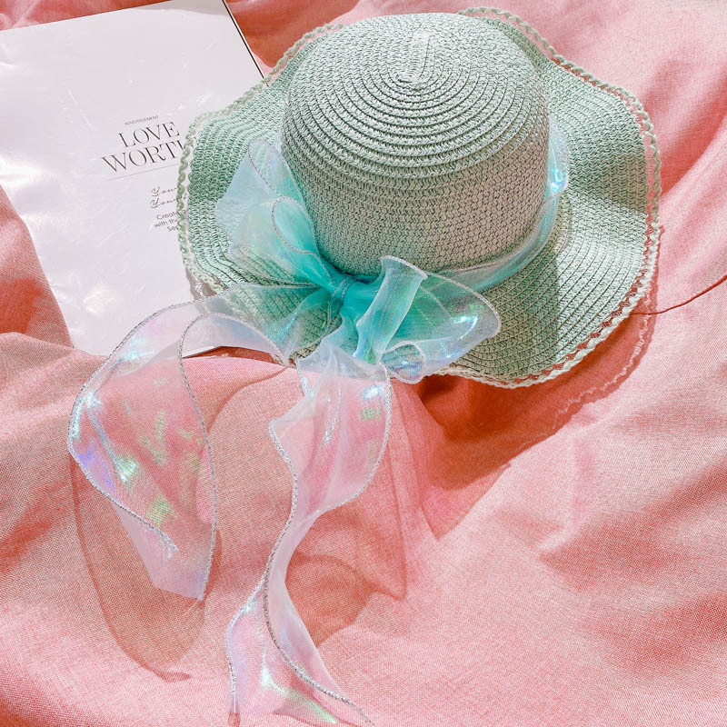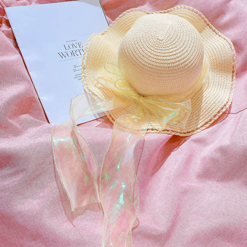 ハワイ 春夏 キッズ 少女 ストローハット 麦わら帽子 日焼け止め カンカン帽 草編み ビーチ海 リボン 6色