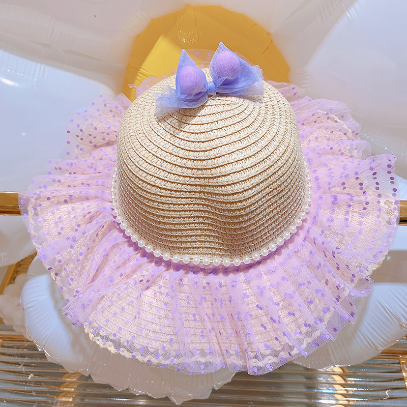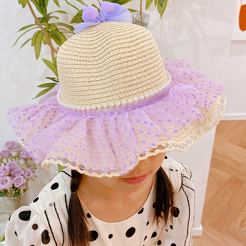 ハワイ 春夏 キッズ少女 ストローハット 麦わら帽子 日焼け止め リボン 草編み ビーチ海 ドット柄 フリル