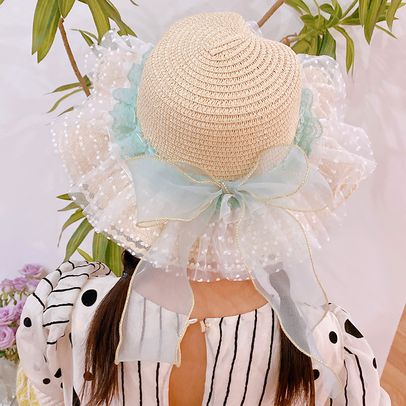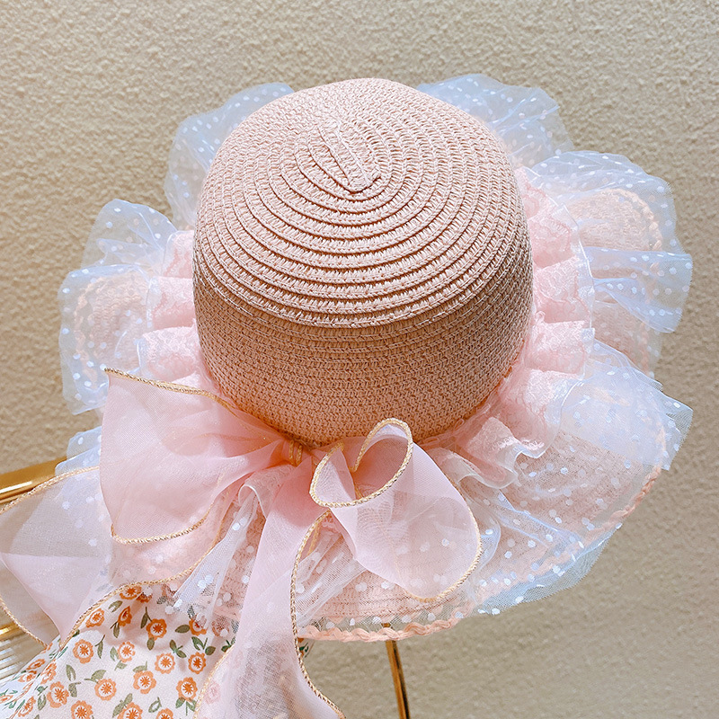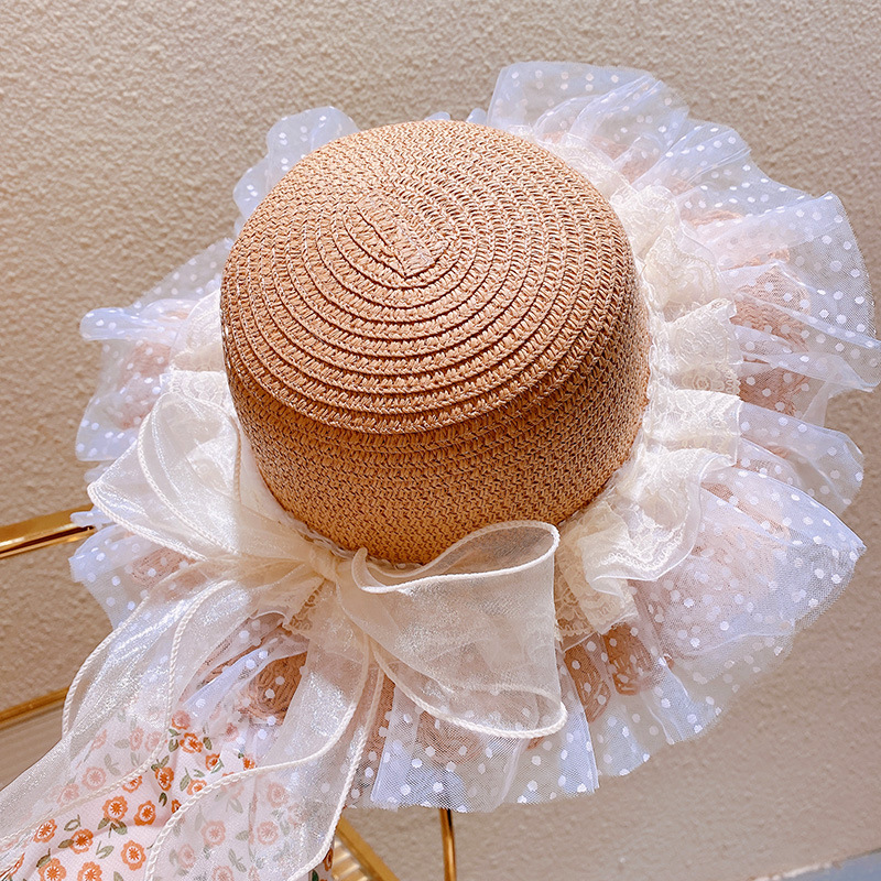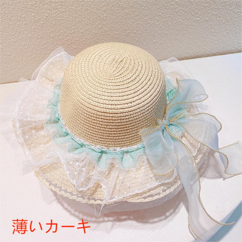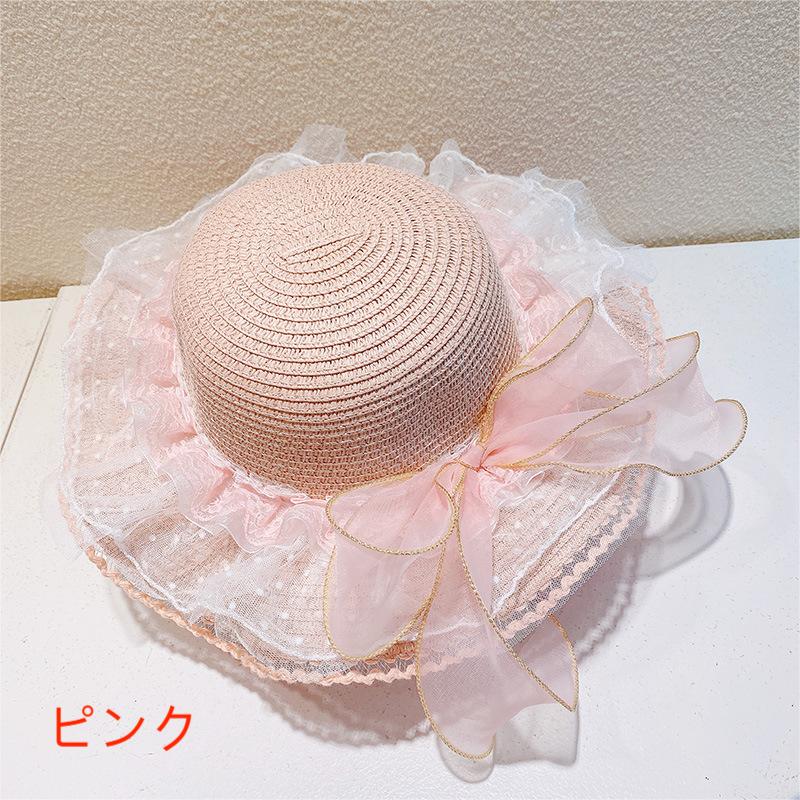 ハワイ 春夏 キッズ少女 ストローハット 麦わら帽子 日焼け止め リボン 草編み ビーチ海 花柄レース フリル