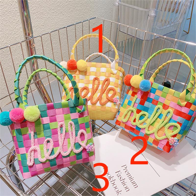 お勧め 春夏 キッズ子供 ポシェット かごバッグ 編みバッグ ガールズ チェック柄 ハンドバッグ ポンポン