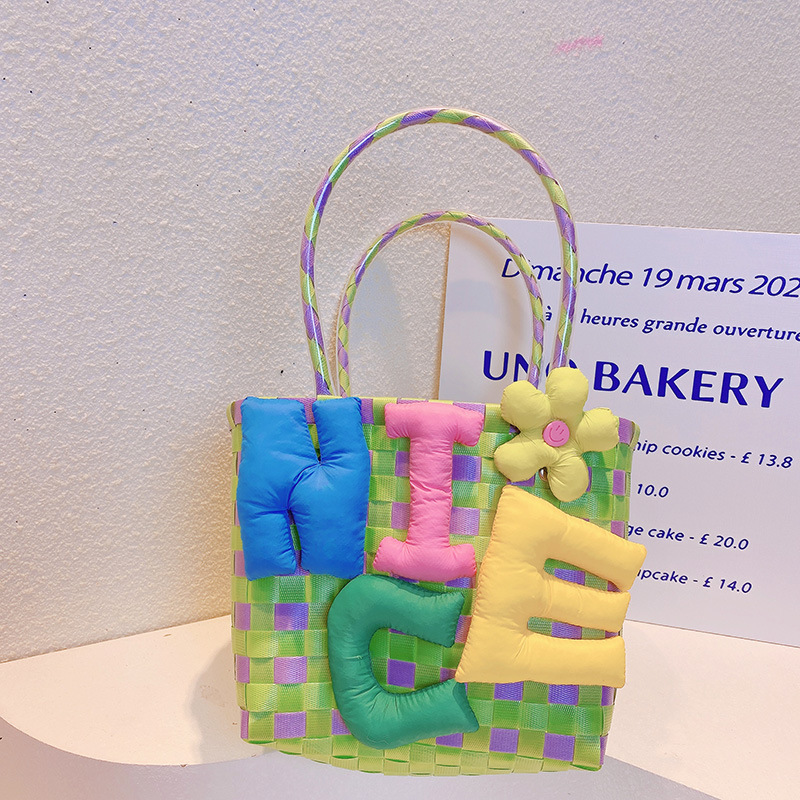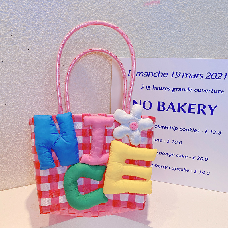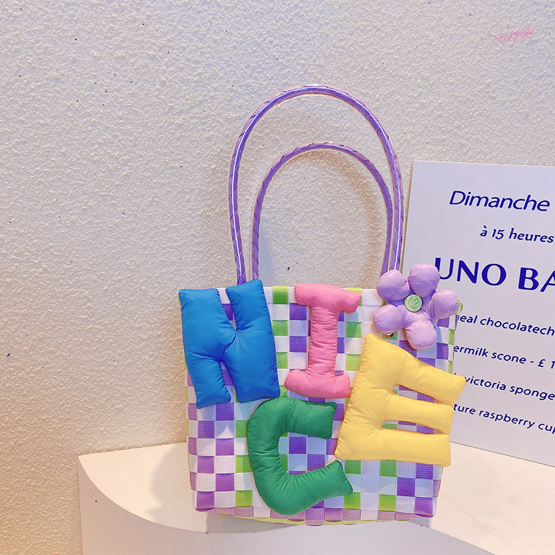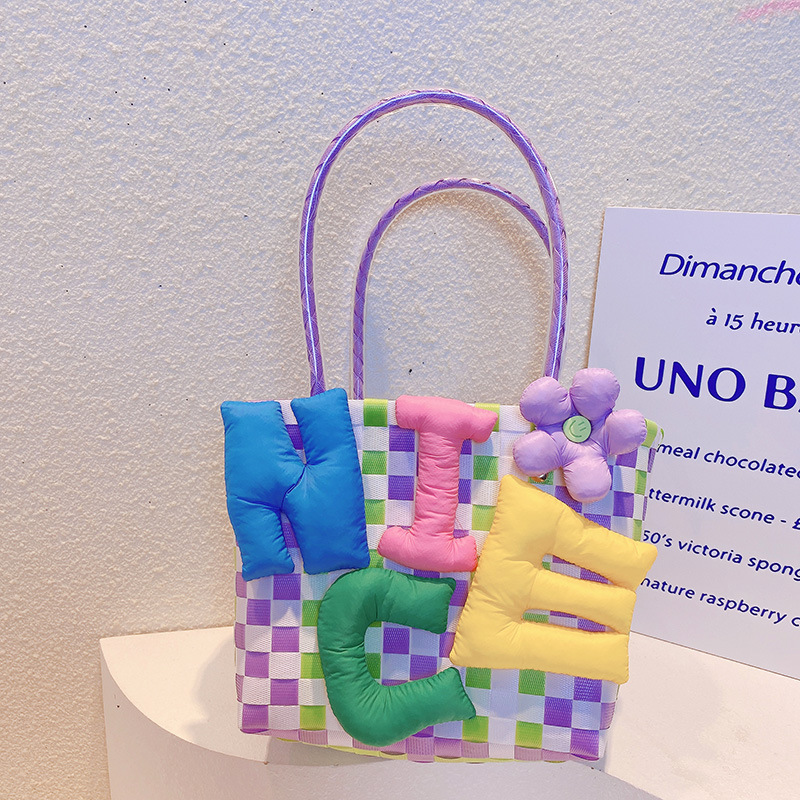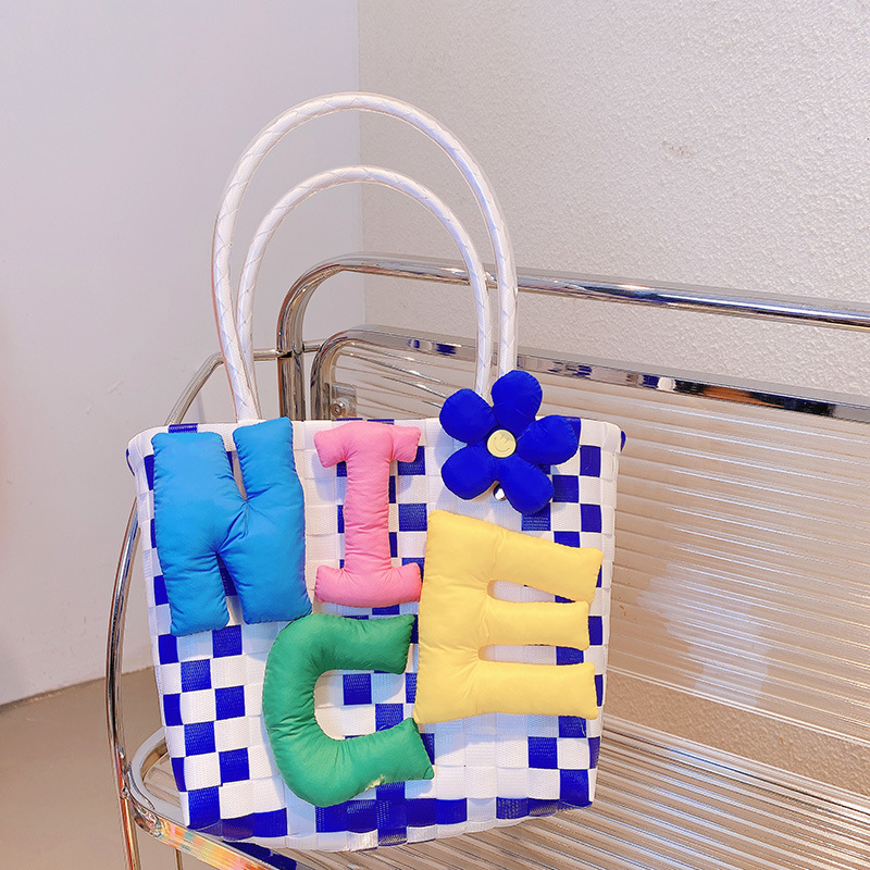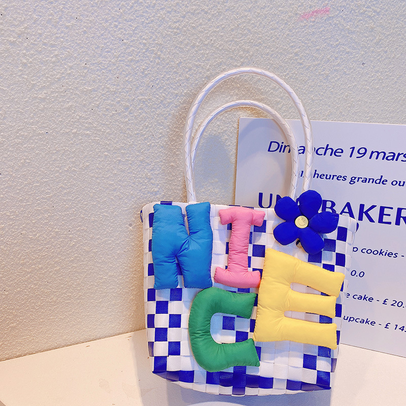 お勧め 春夏 キッズ子供 ポシェット かごバッグ 編みバッグ ガールズ チェック柄 ハンドバッグ ぬいぐるみ