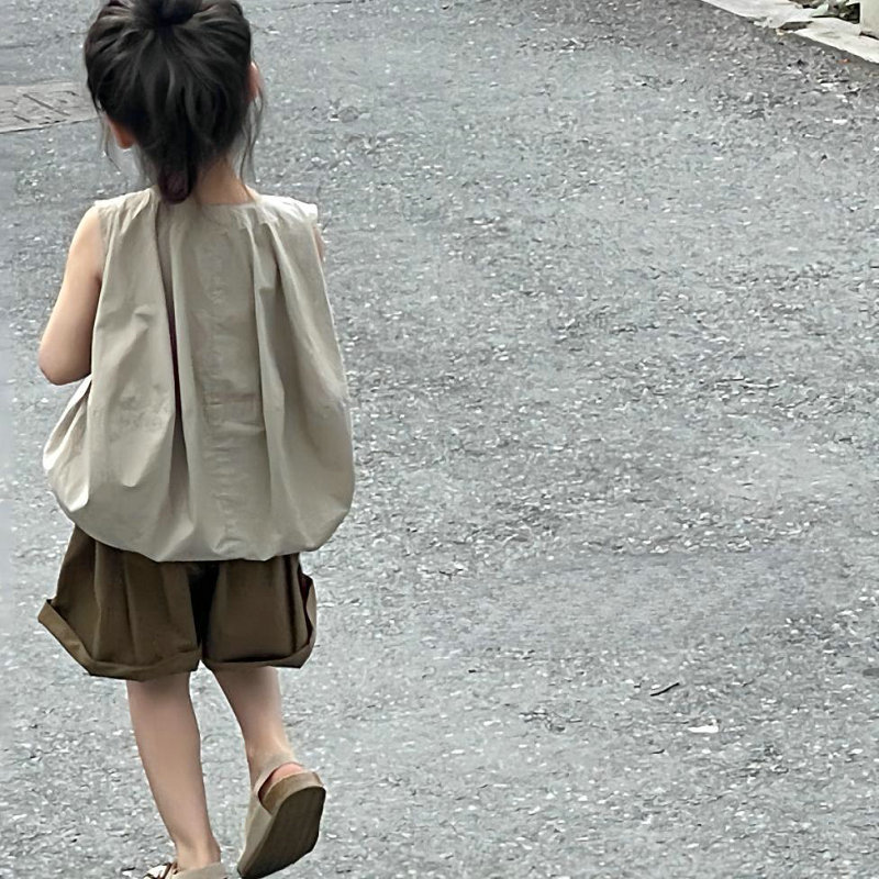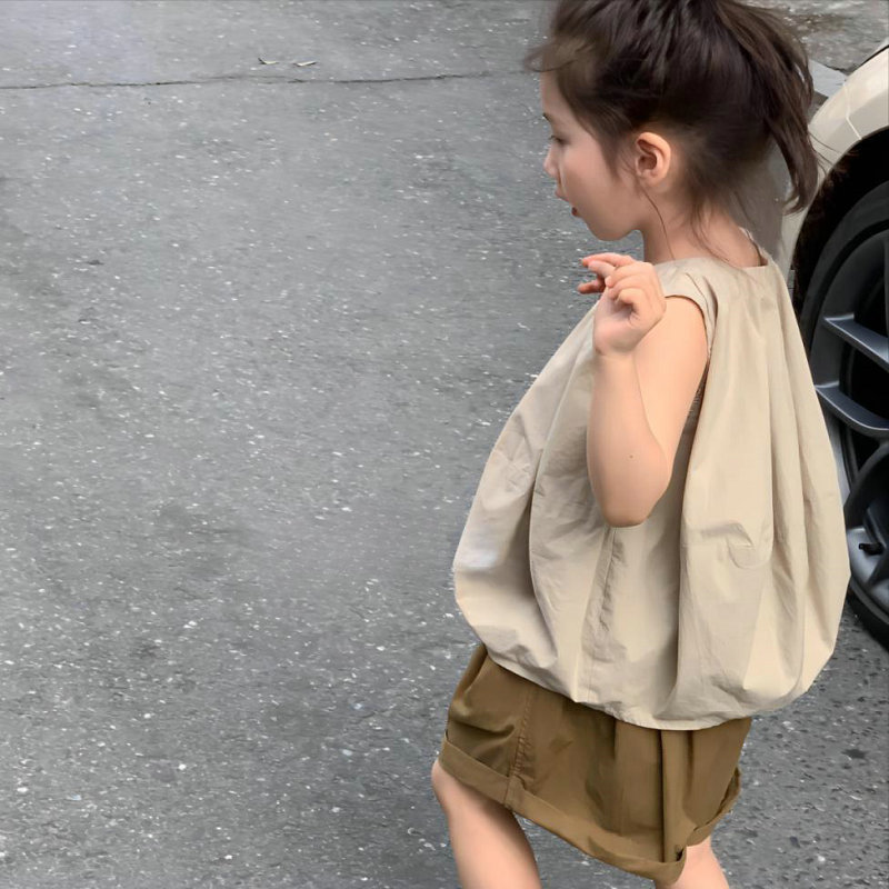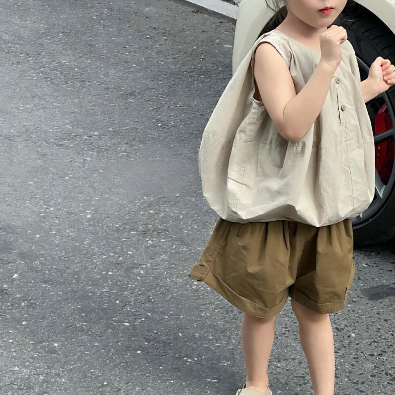 お勧め 春夏 韓国風子供服 ガール ノースリープ ワイドパンツ 袖なし上着 シャツ+ショートパンツ 5-13