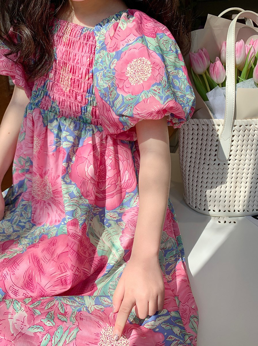 お勧め 春夏 韓国風子供服 ガール ボタニカル パフスリーブドレス ワンピース ゆったり ワンピ 7-15