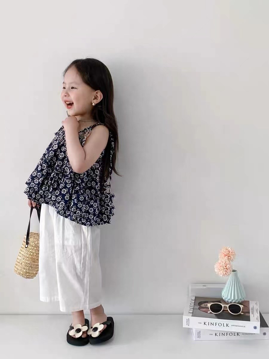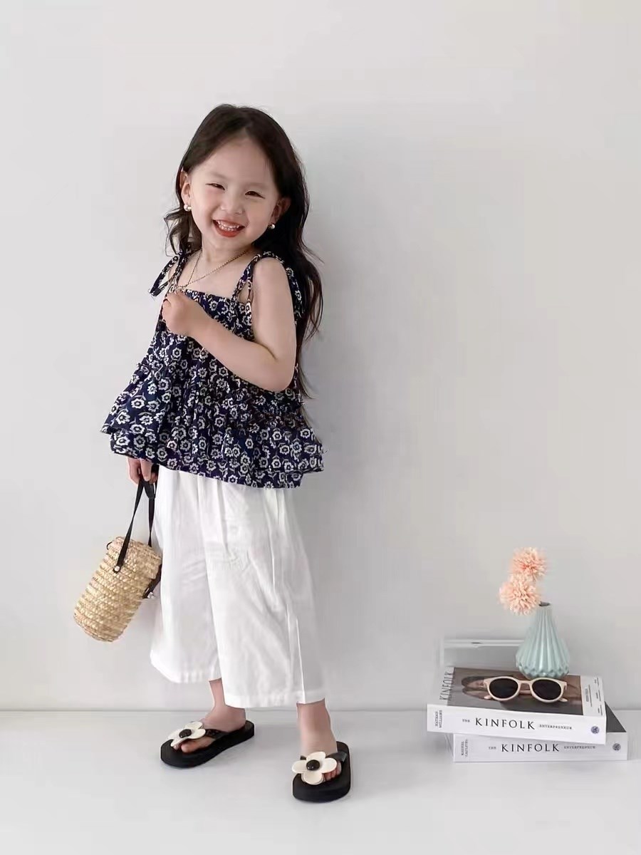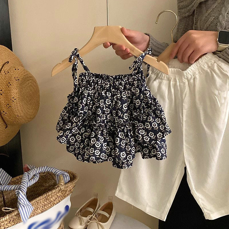 お勧め 春夏 韓国風子供服 フリル レースアップ キャミソール+ズボン ワイドパンツ ブラウス 小花柄 7-15
