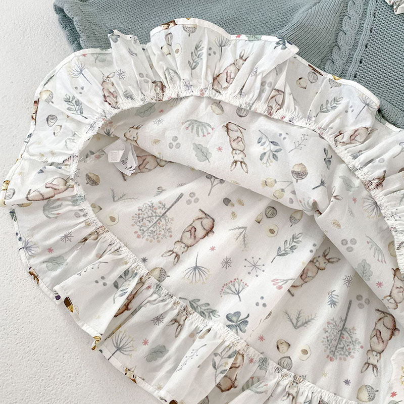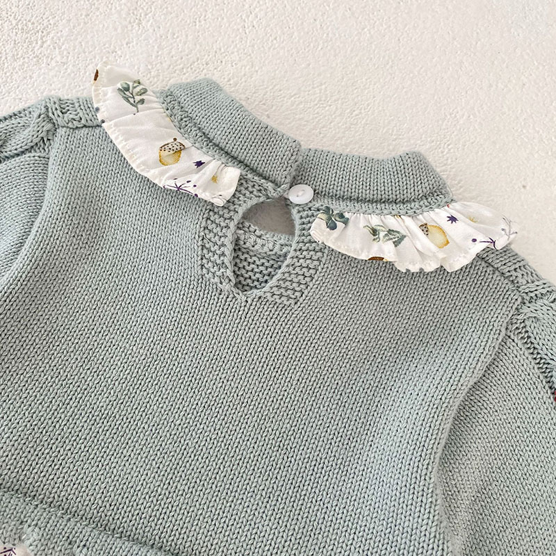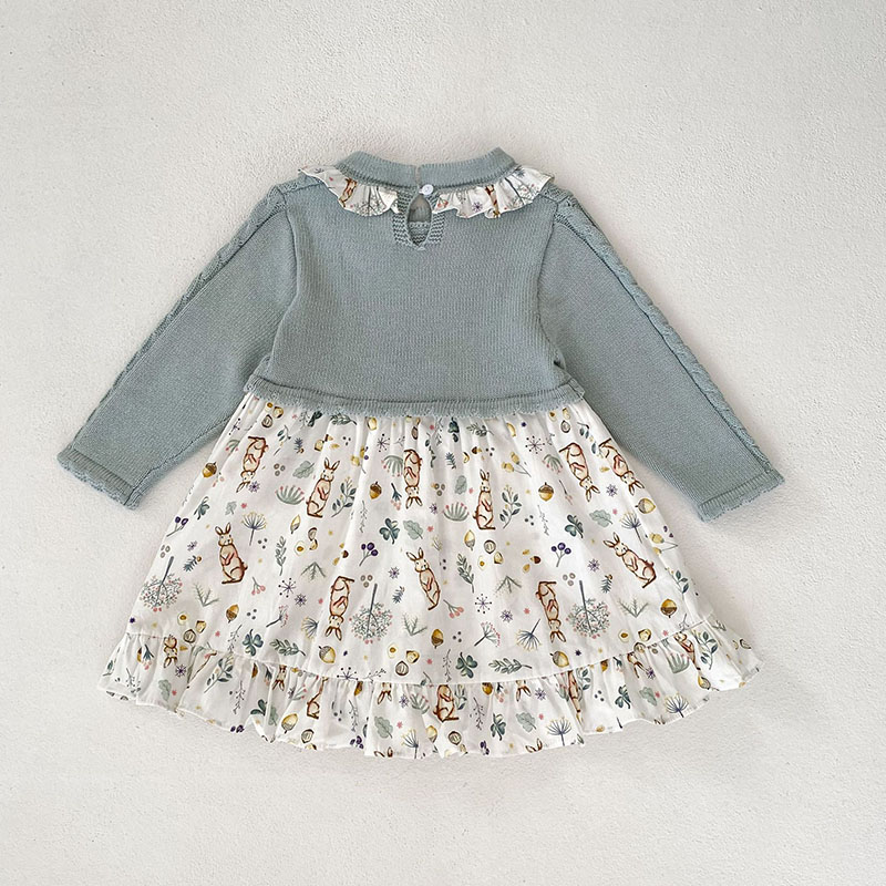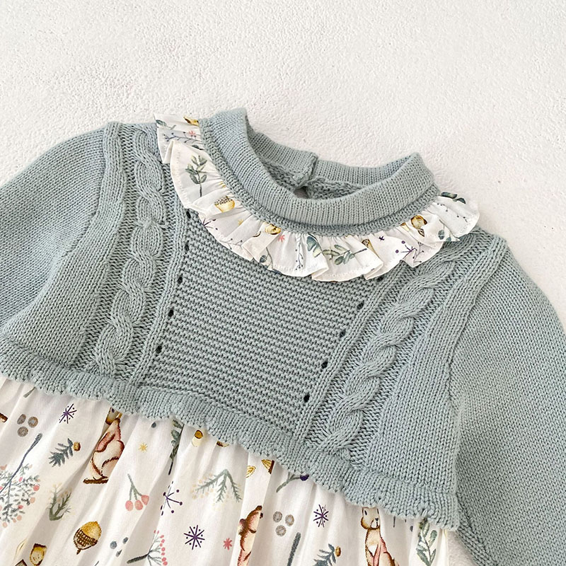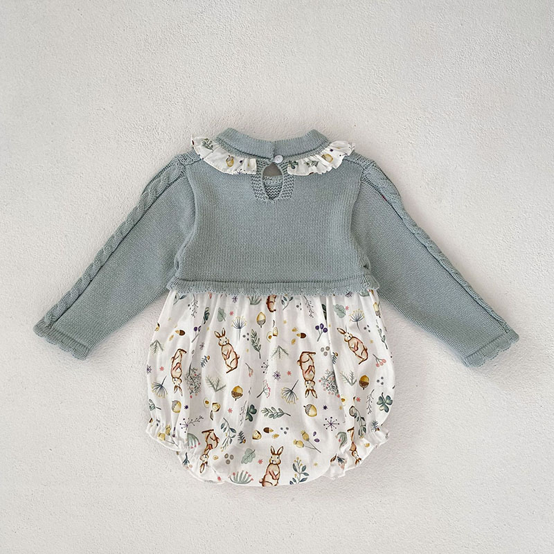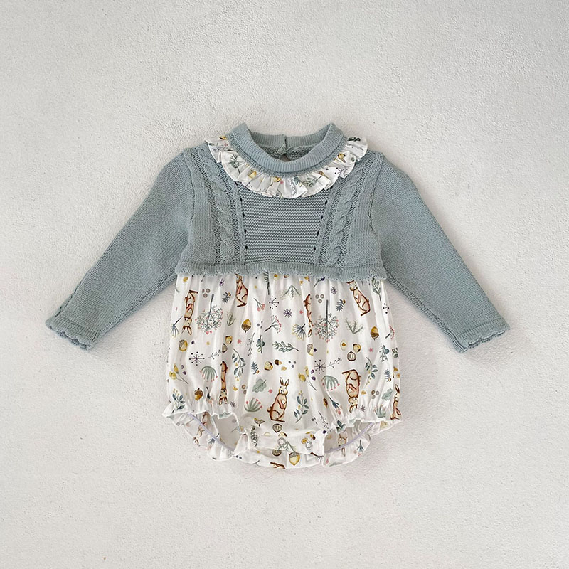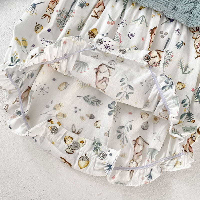 秋冬新作 ガールズ 連体服 花柄兎 フリル ワンピース ニット ロンパース カバーオール 66-90/73-110