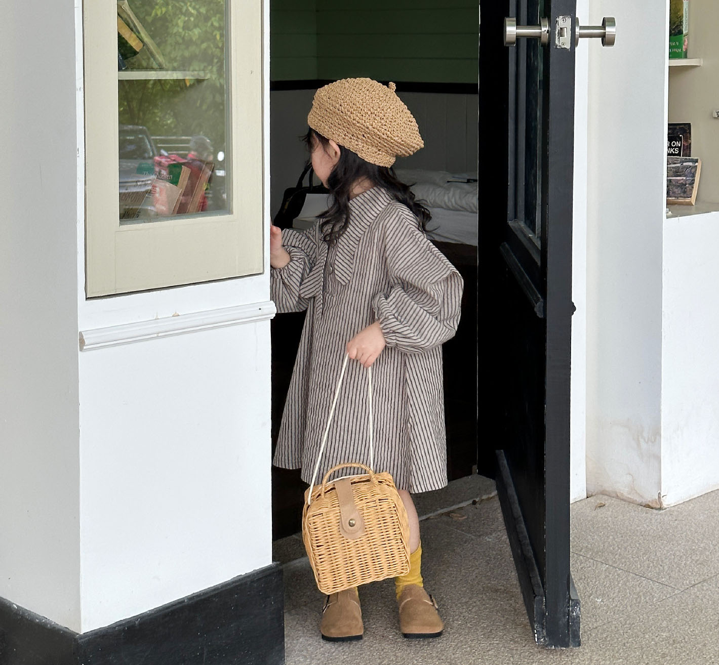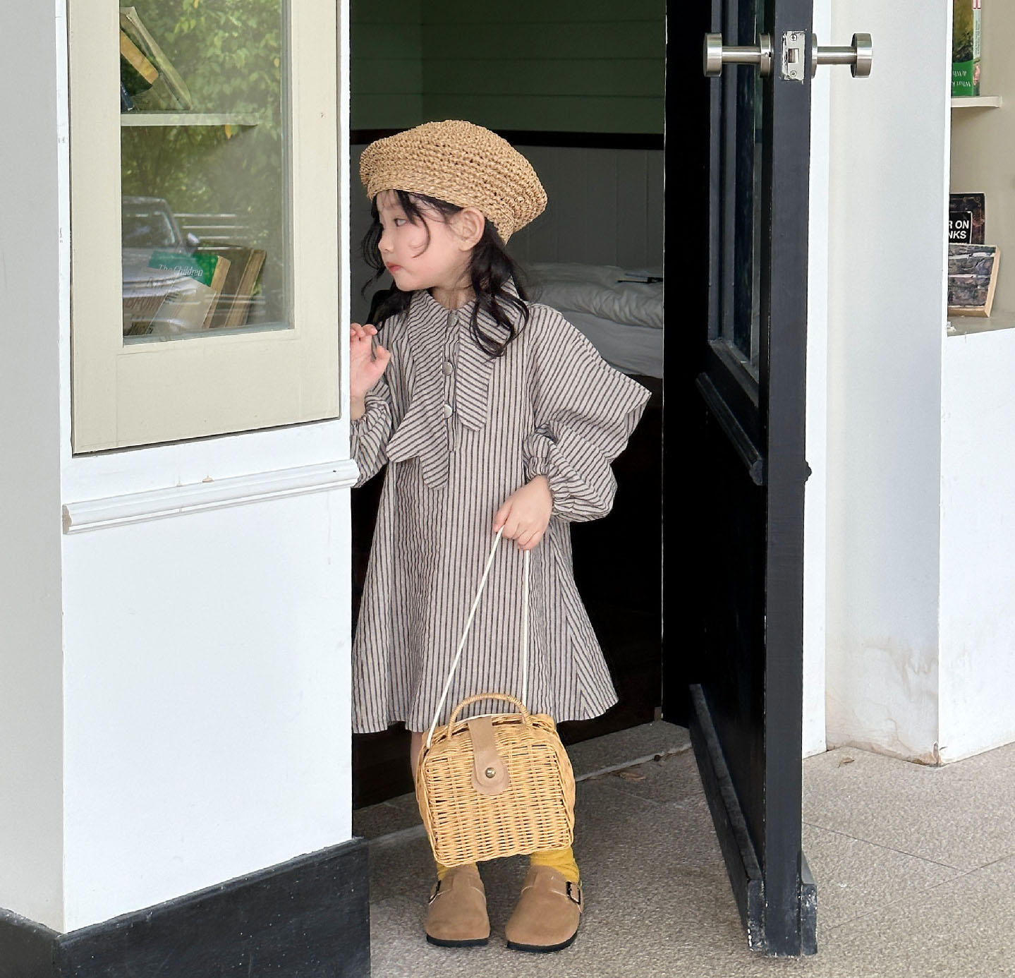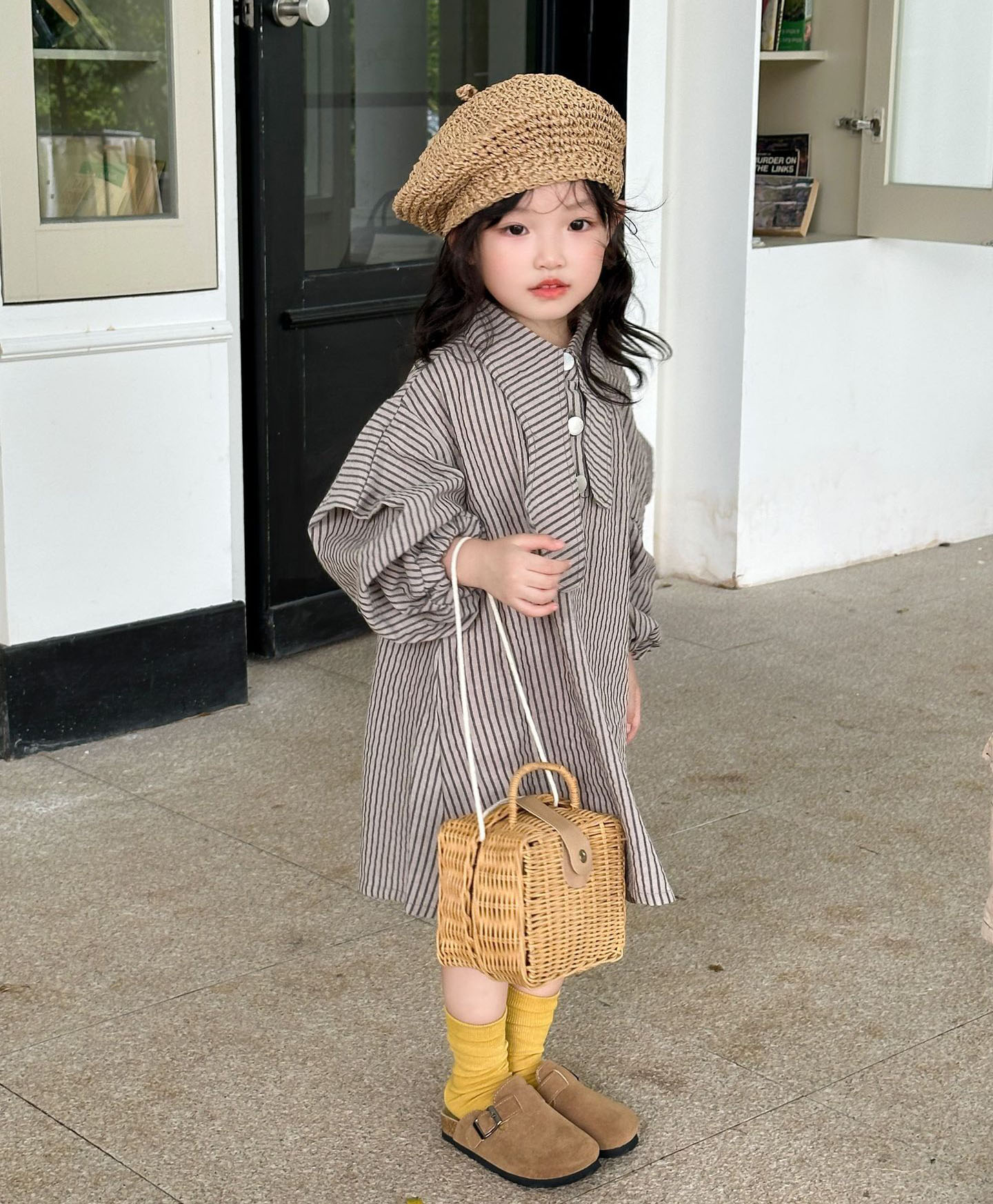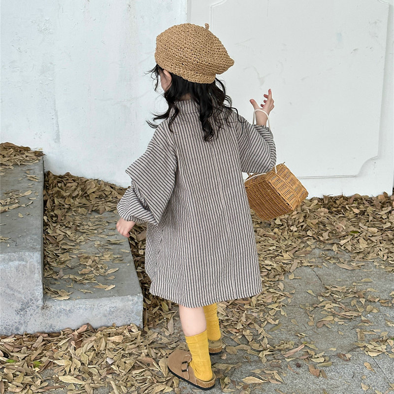 オシャレ春秋 ガールズ ビショップ・スリーブ ストライプ柄 シフトドレス ワンピース ワンピ 7-15