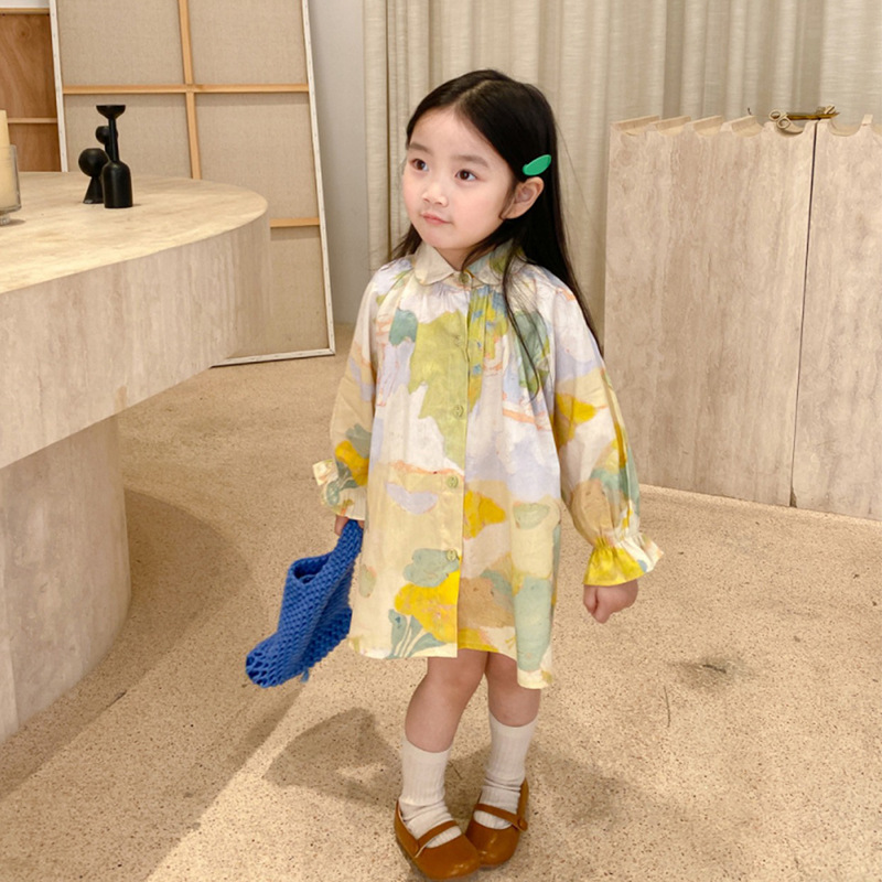 秋新作 ガールズ 子供服 シフトドレス 水彩 油絵 ワンピース シャツドレス フリル ワンピ 90-140