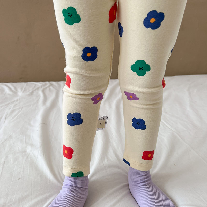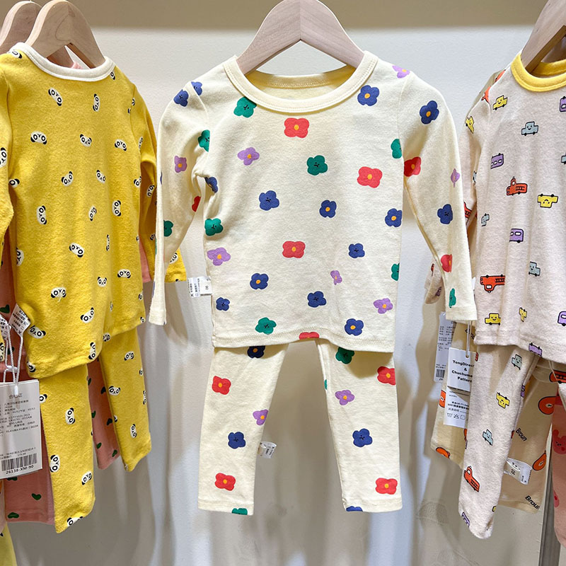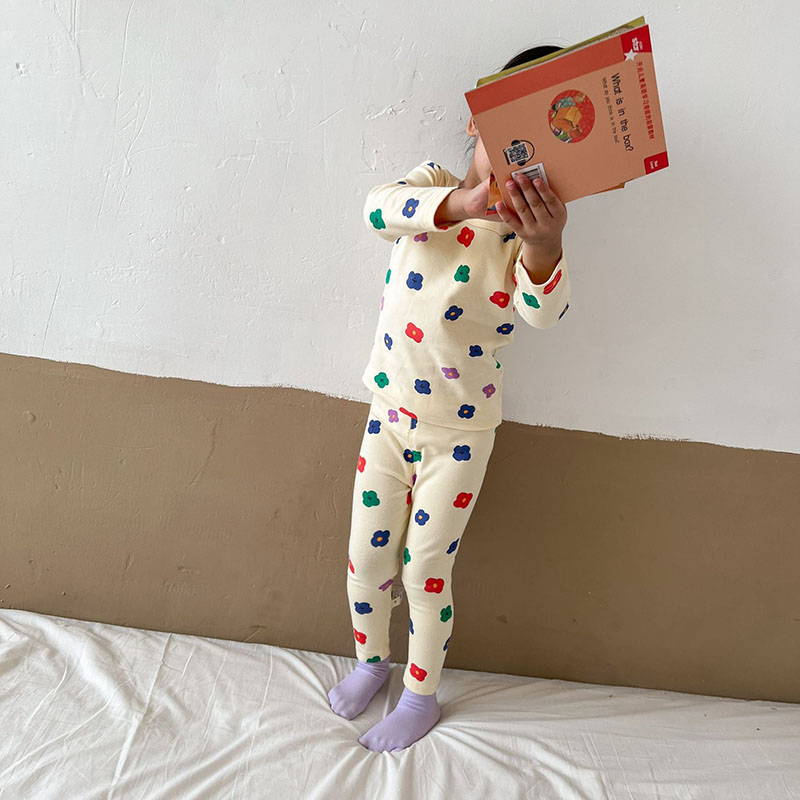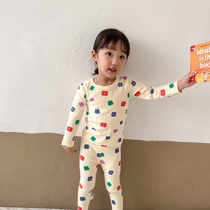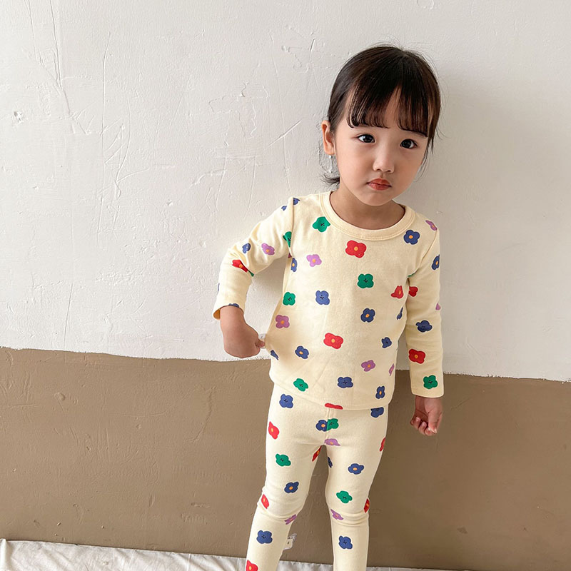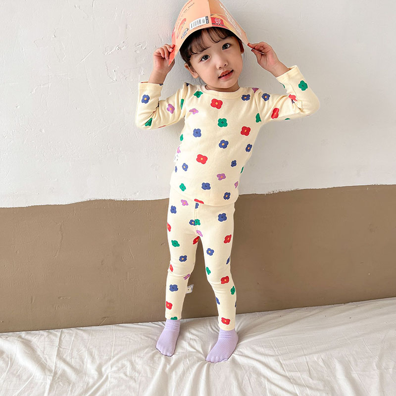 秋冬新作 ユニセックス ルームウェア 保温インナー ボディスーツ 花フラワー Tシャツ+ズボン 80-150
