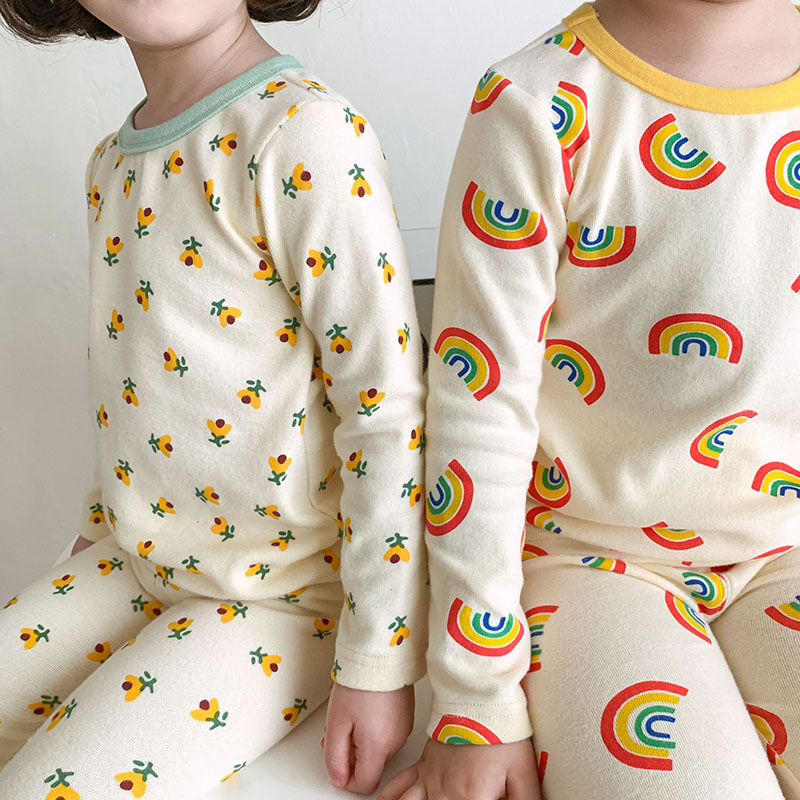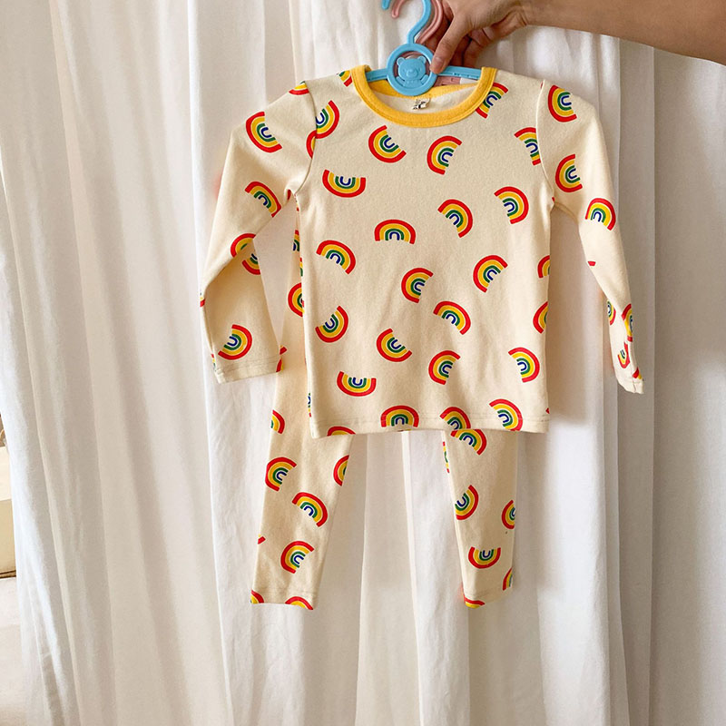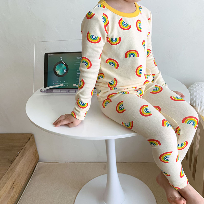 秋冬新作 ユニセックス ルームウェア 保温インナー ボディスーツ 虹 Tシャツ+ズボン 90-130