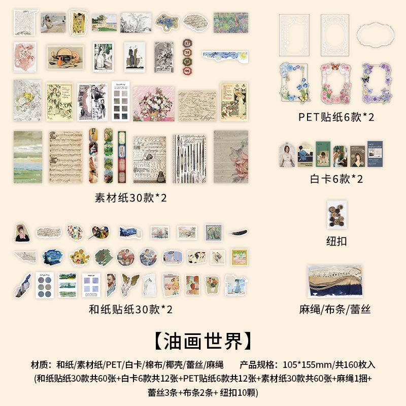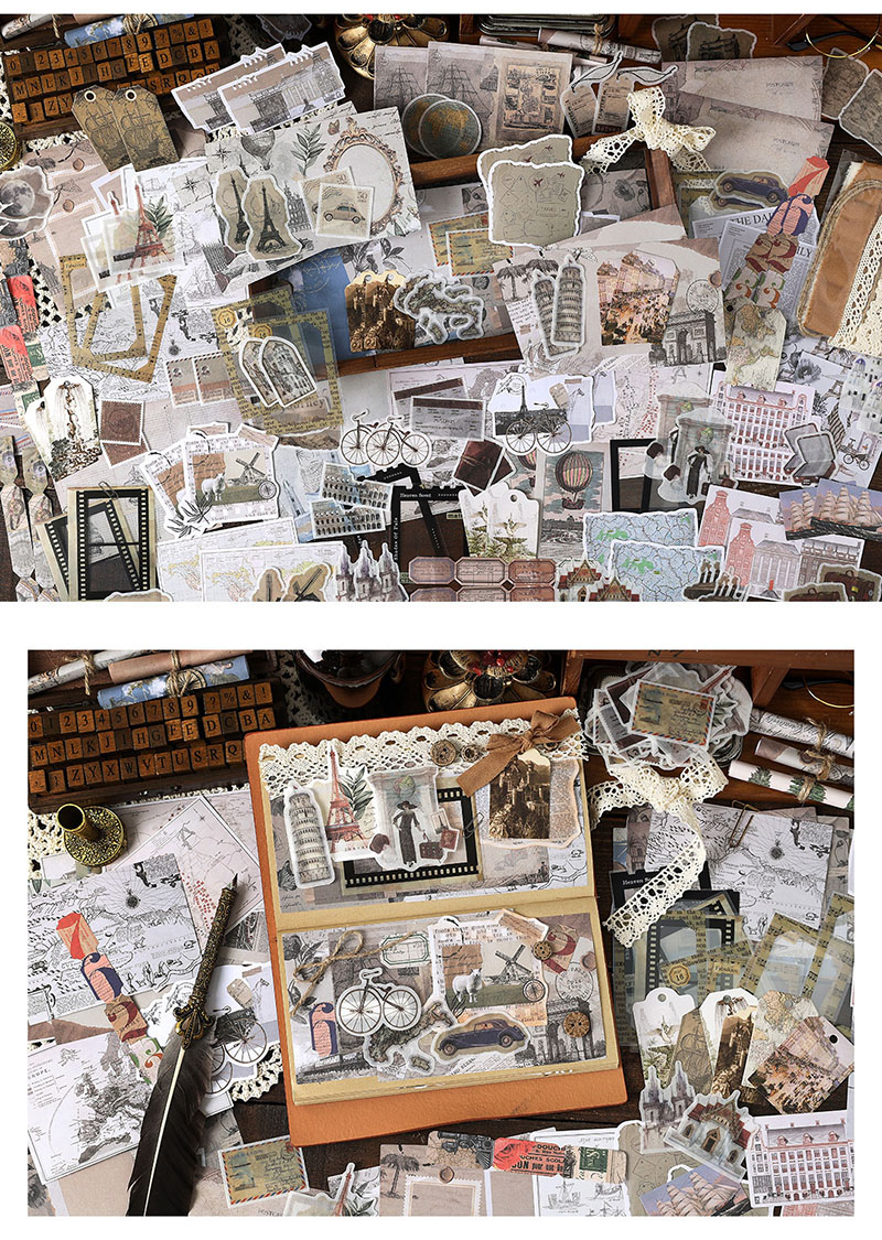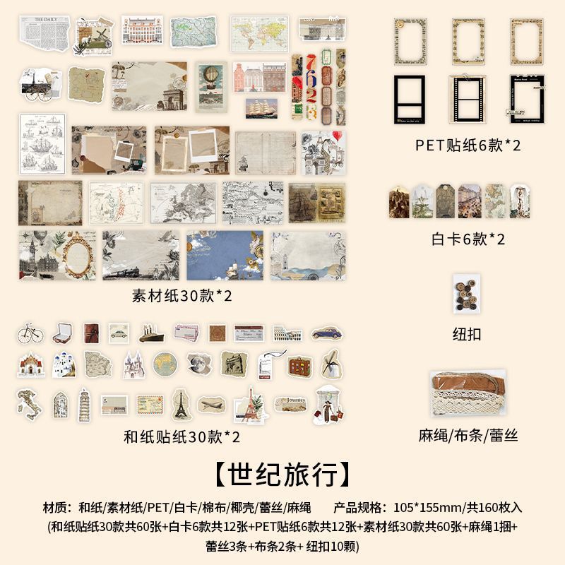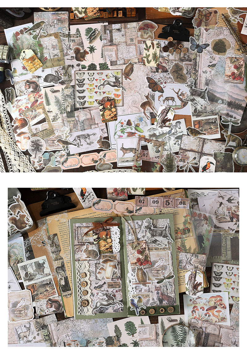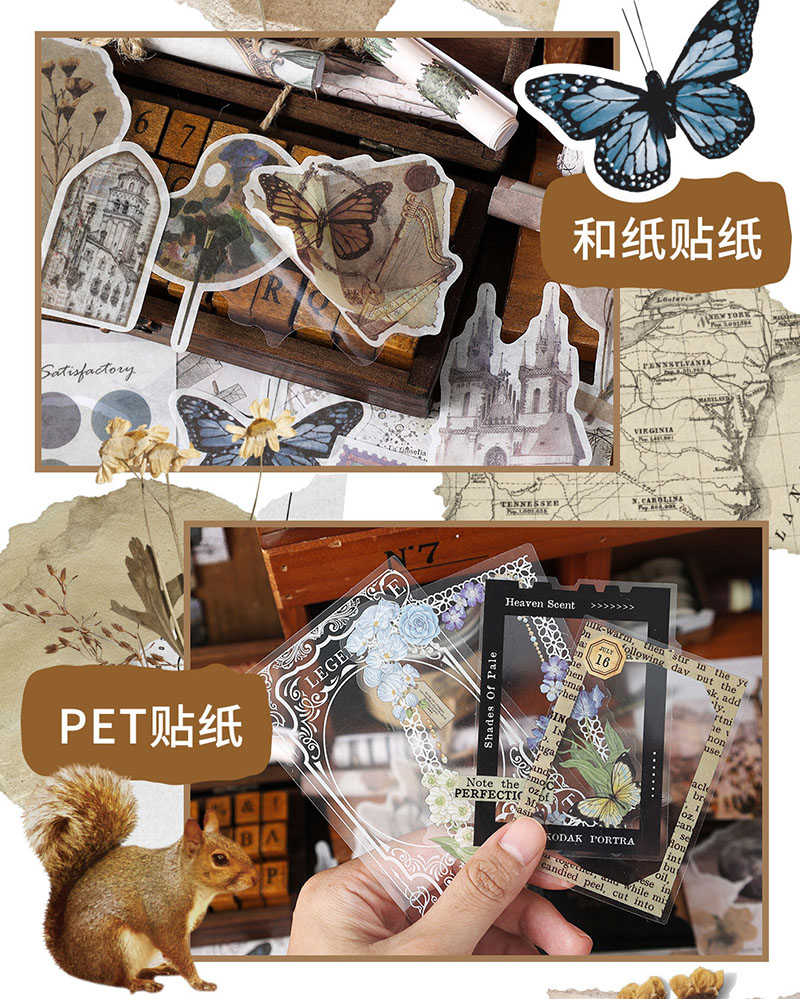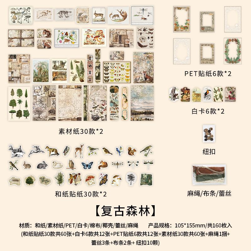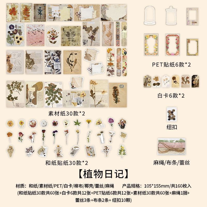 秋新作 ペーパー ステッカー アンティーク 植物花葉 キノコ アニマル ボタン PET+紙 シール 160枚入