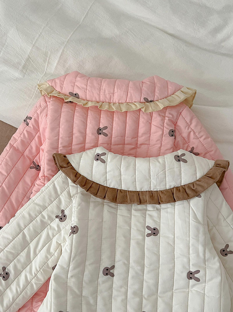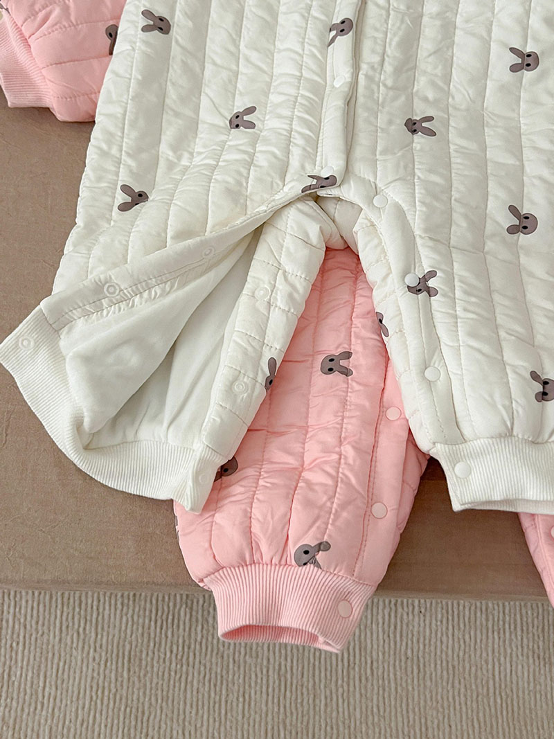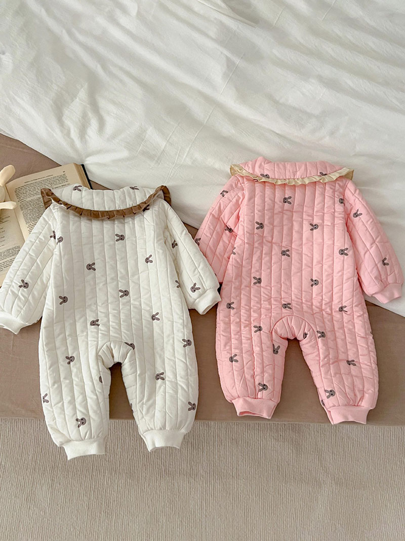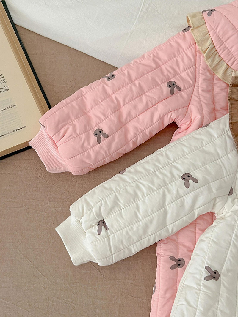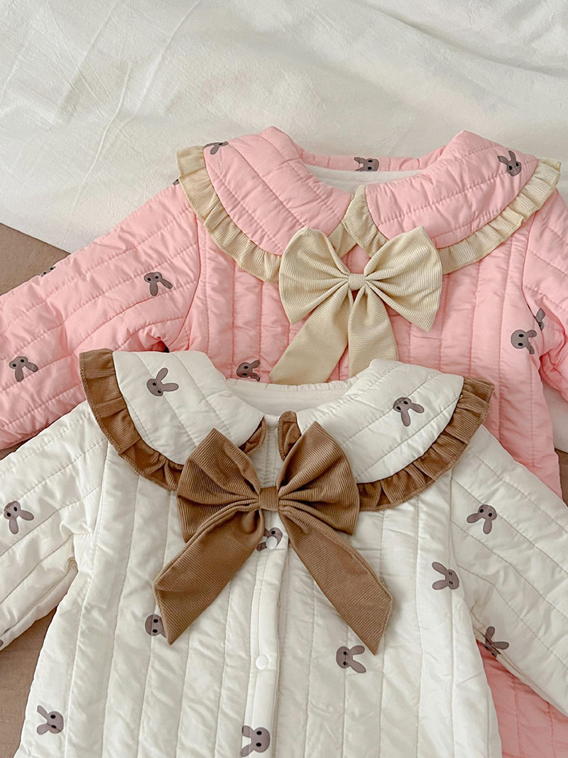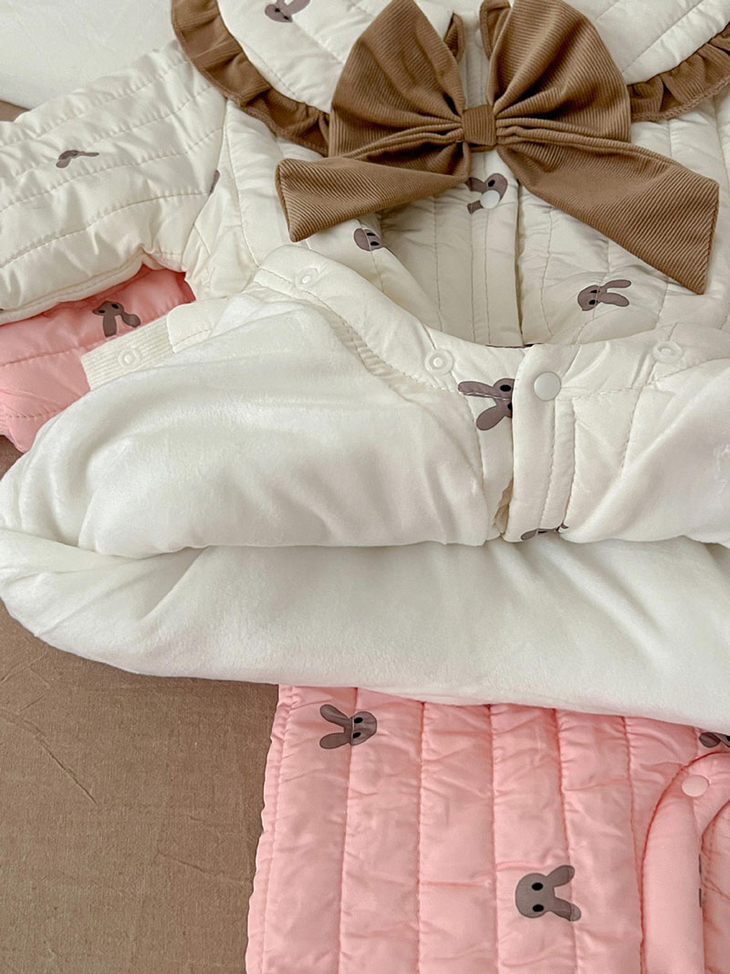秋冬新作 ガール 連体服 兎 リボン フリル 裏ボア裏起毛 キルティング ロンパース カバーオール 66-100
