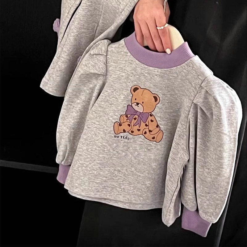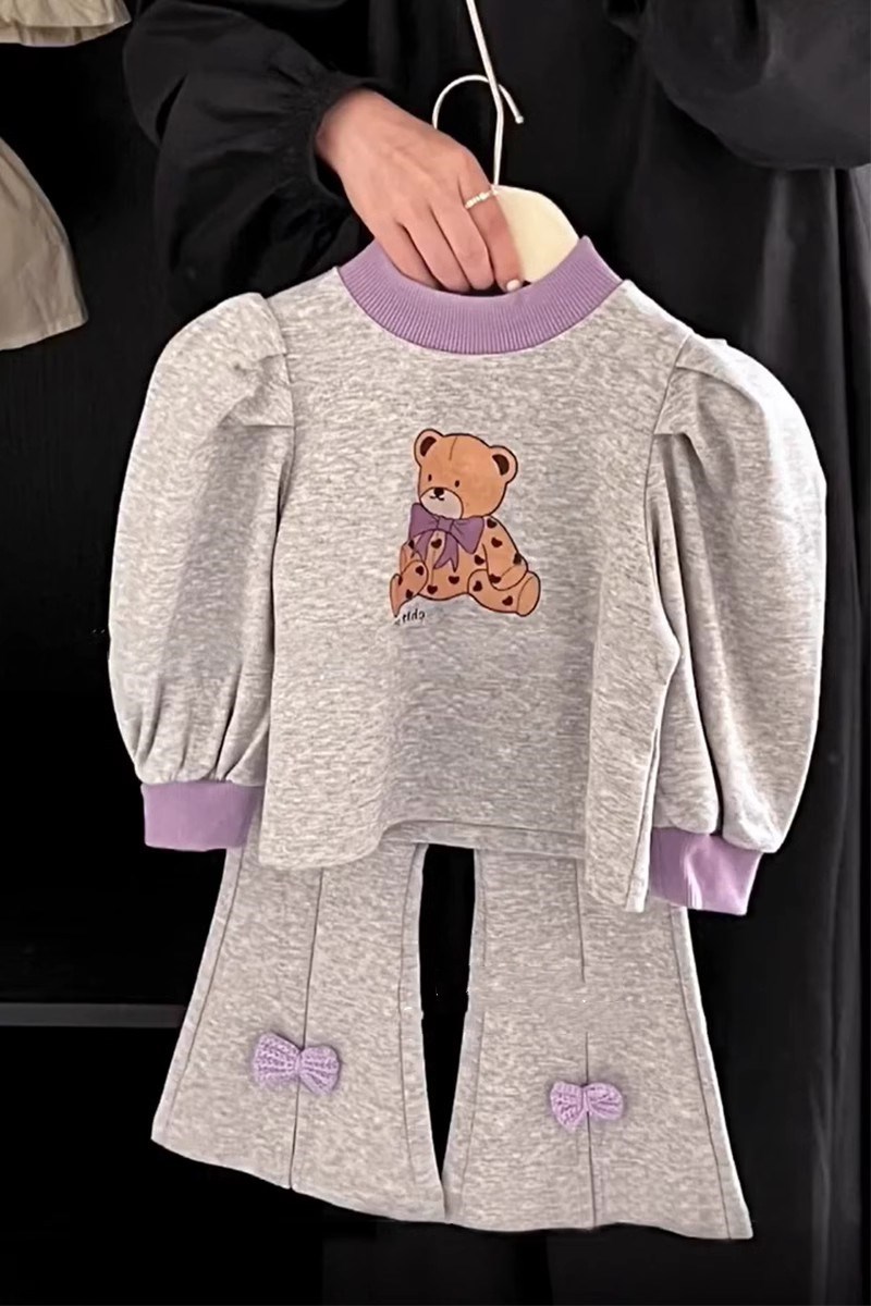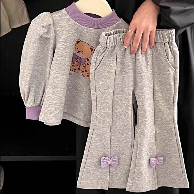 秋冬新作 ガールズ 子供服 ロングパンツ ゆったり フーディ 熊 リボン Tシャツ+ズボン ベルボトム 5-13