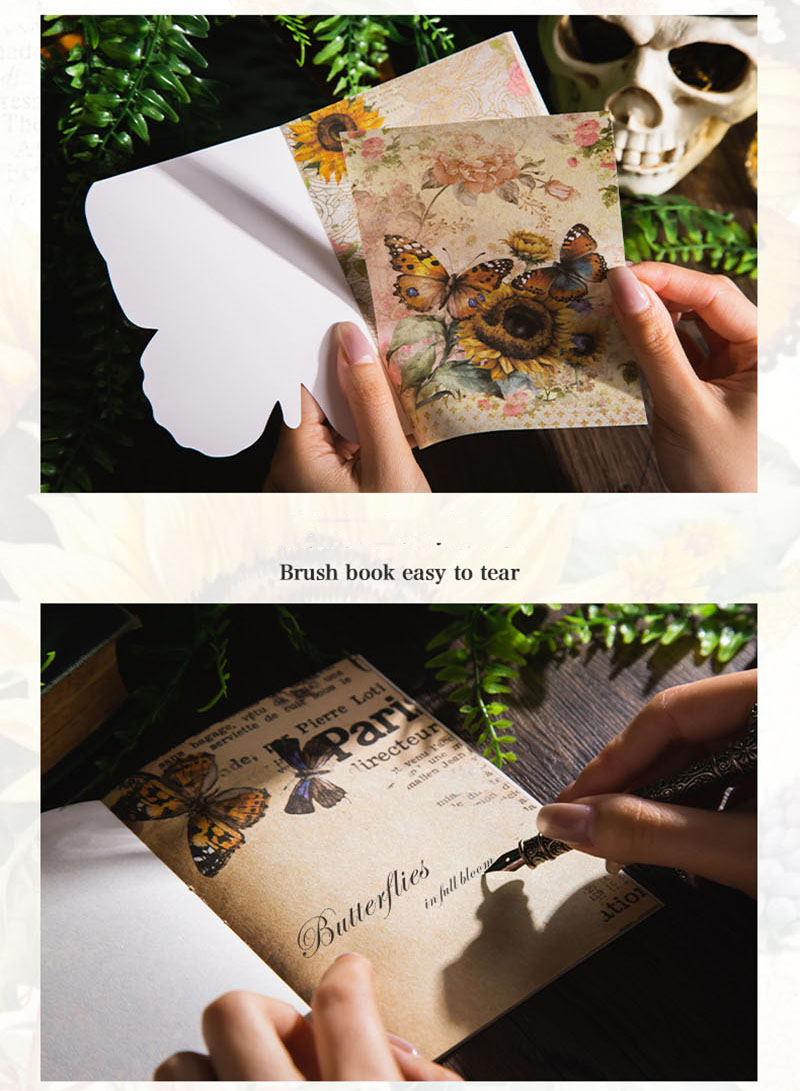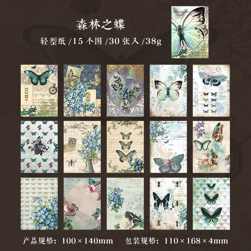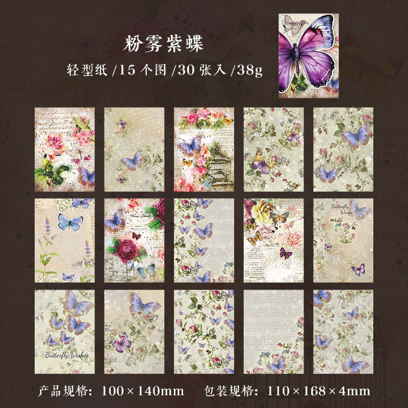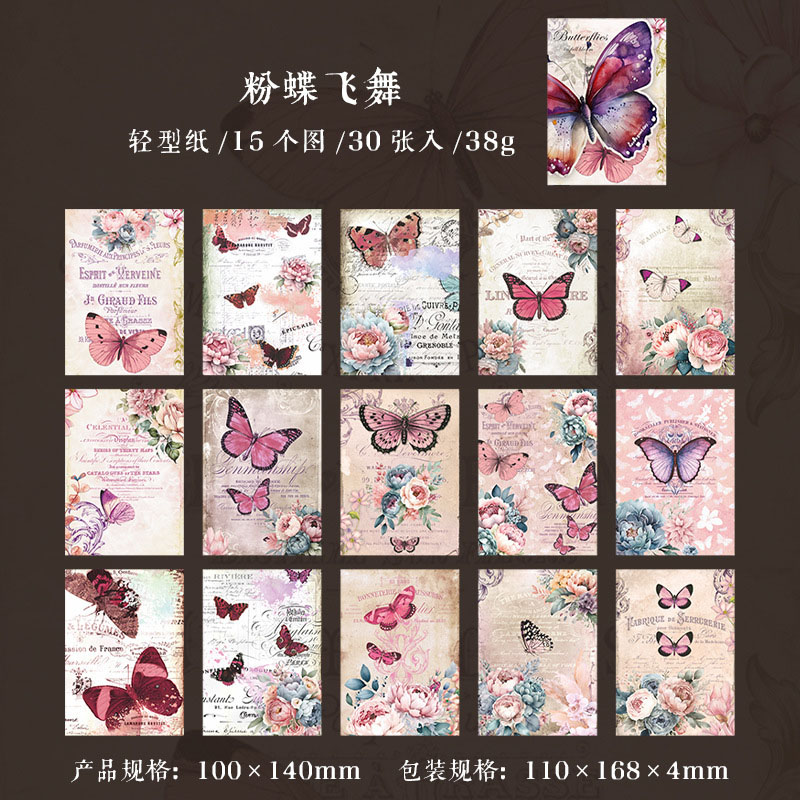 インテリア ペーパー 素材紙 アンティーク イラスト バタフライ蝶 花フラワー 薔薇ローズ 30枚入