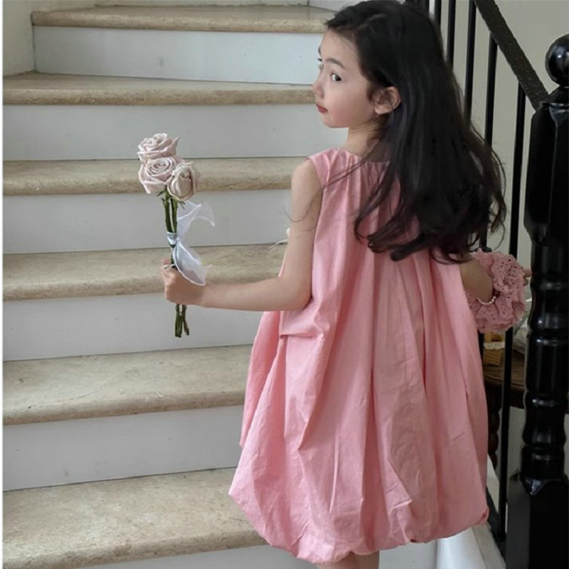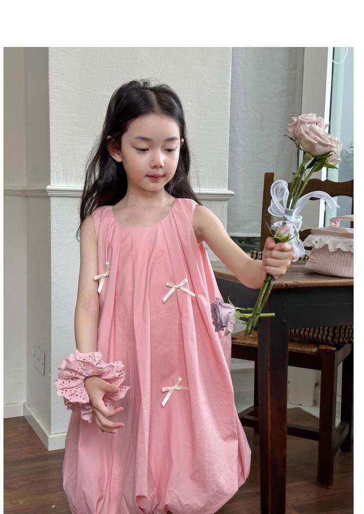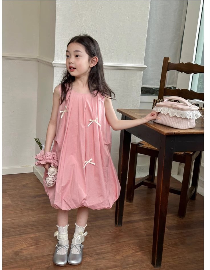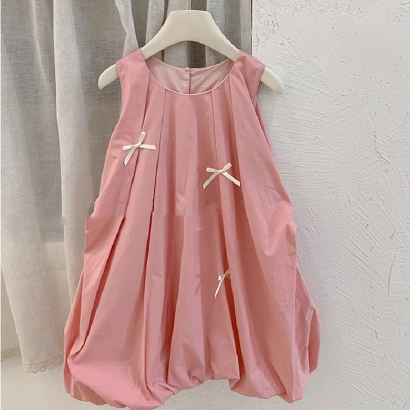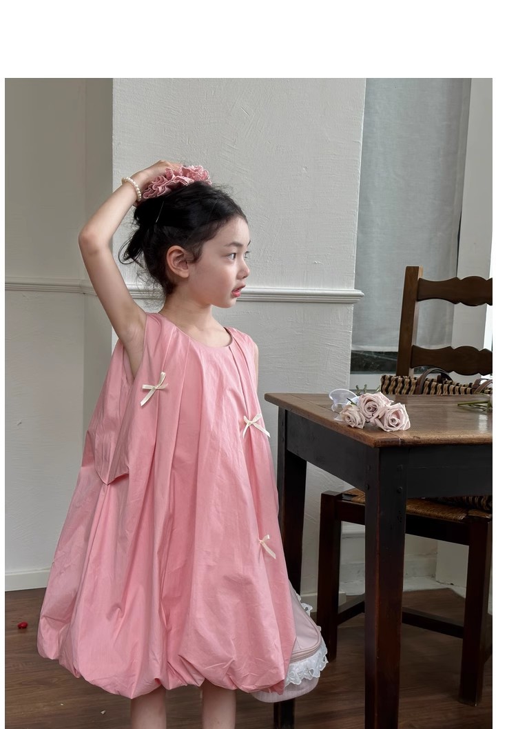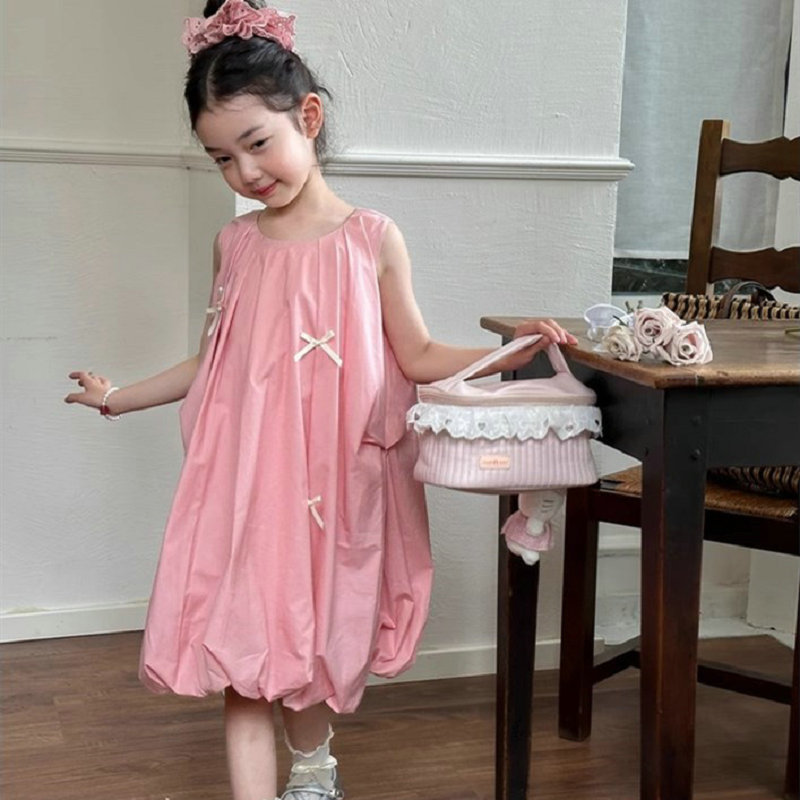韓国風子供服 キッズ ガール シフトドレス ノースリープ リボン コクーンスカート ワンピース ワンピ 7-17
