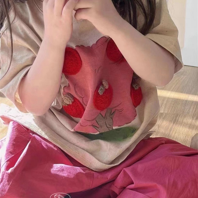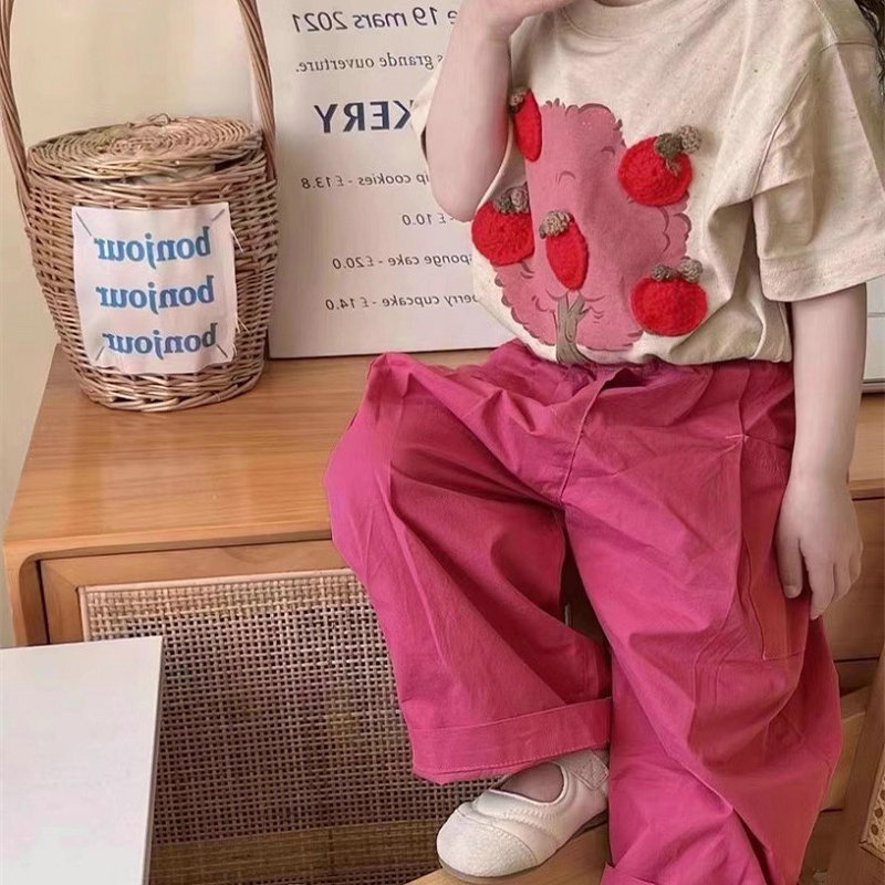 韓国風子供服 春夏 ガールズ 3-8歳 リンゴ ガウチョパンツ 半袖上着 Tシャツ +七分丈ズボン 5-13