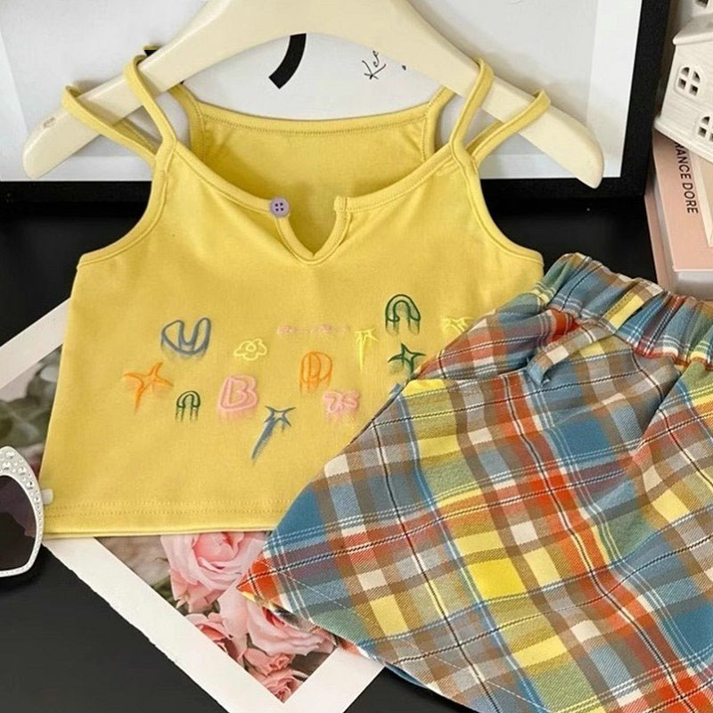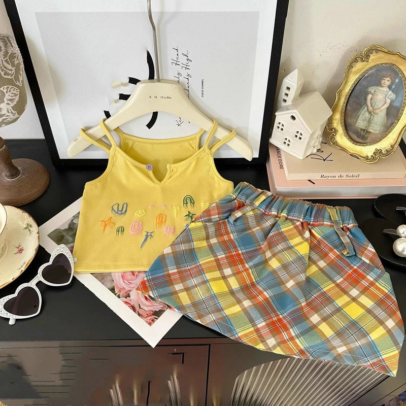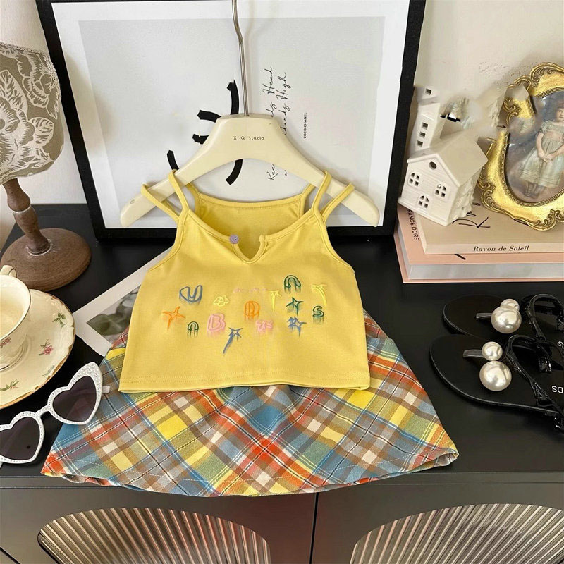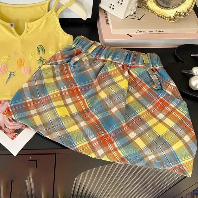 韓国風子供服 春夏 ガールズ 3-8歳 刺繍 チェック柄 ミニスカート キャミソール 上着+スカート 5-13