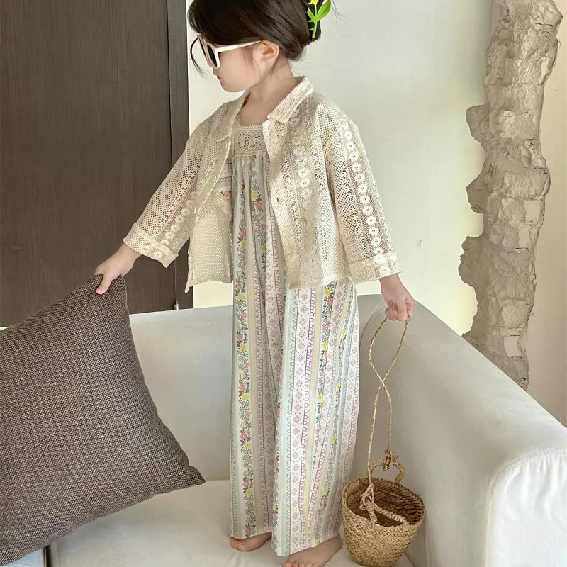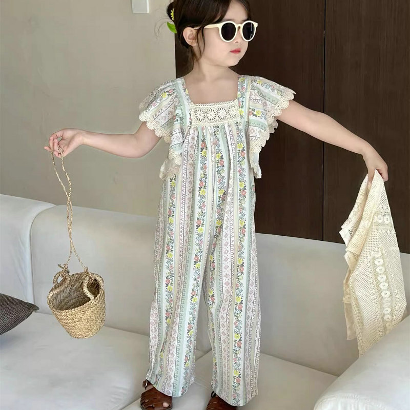 韓国風子供服 春夏 ガール3-8歳 花柄 ジャケット 連体服 ガウチョパンツ フリル 連体ズボン 7-17