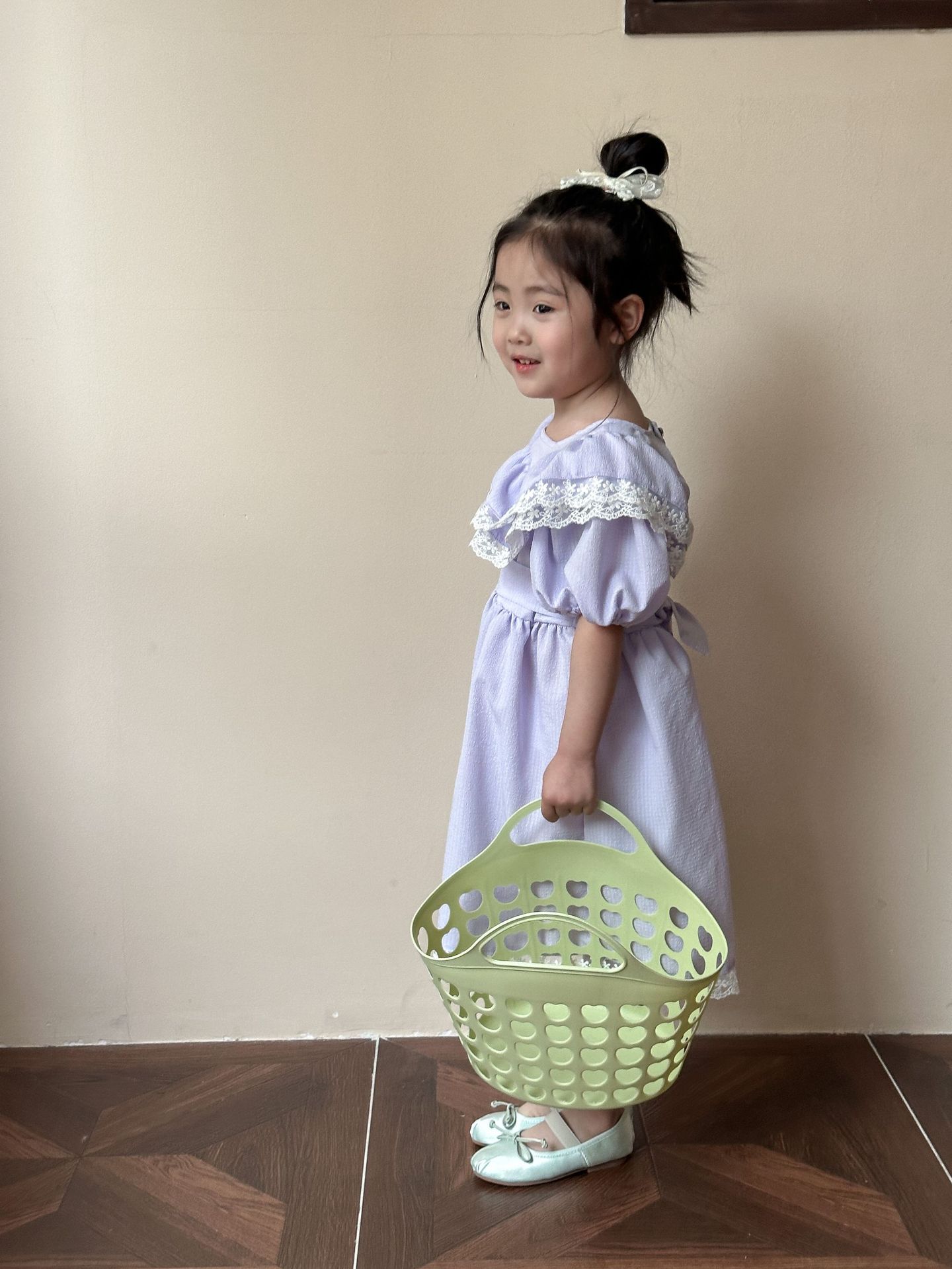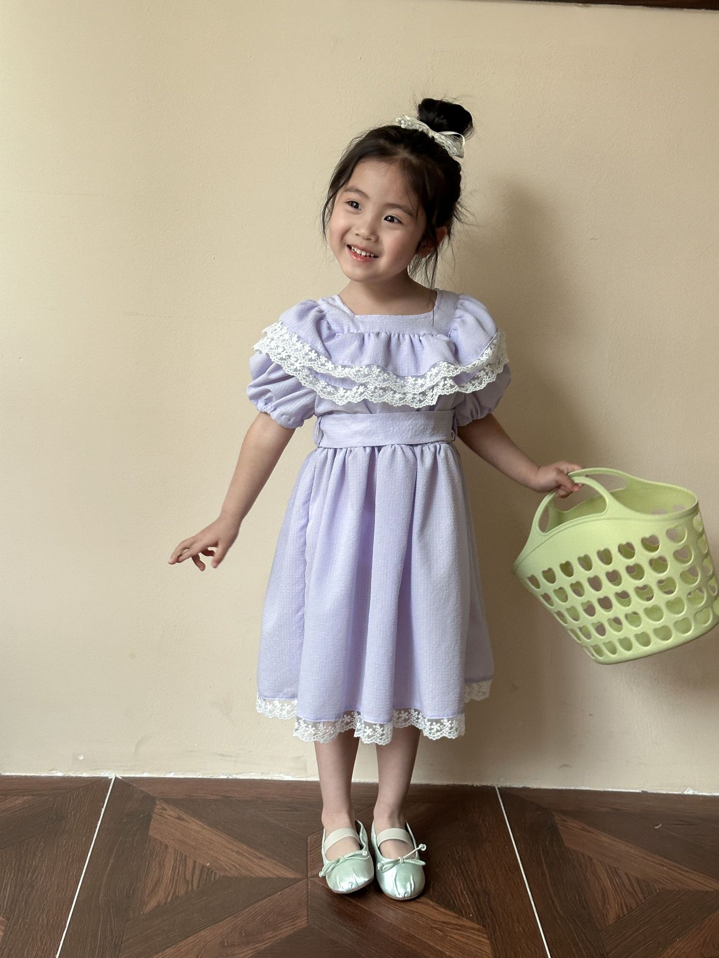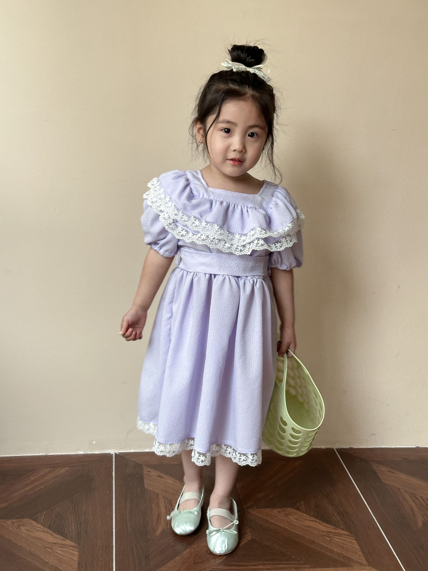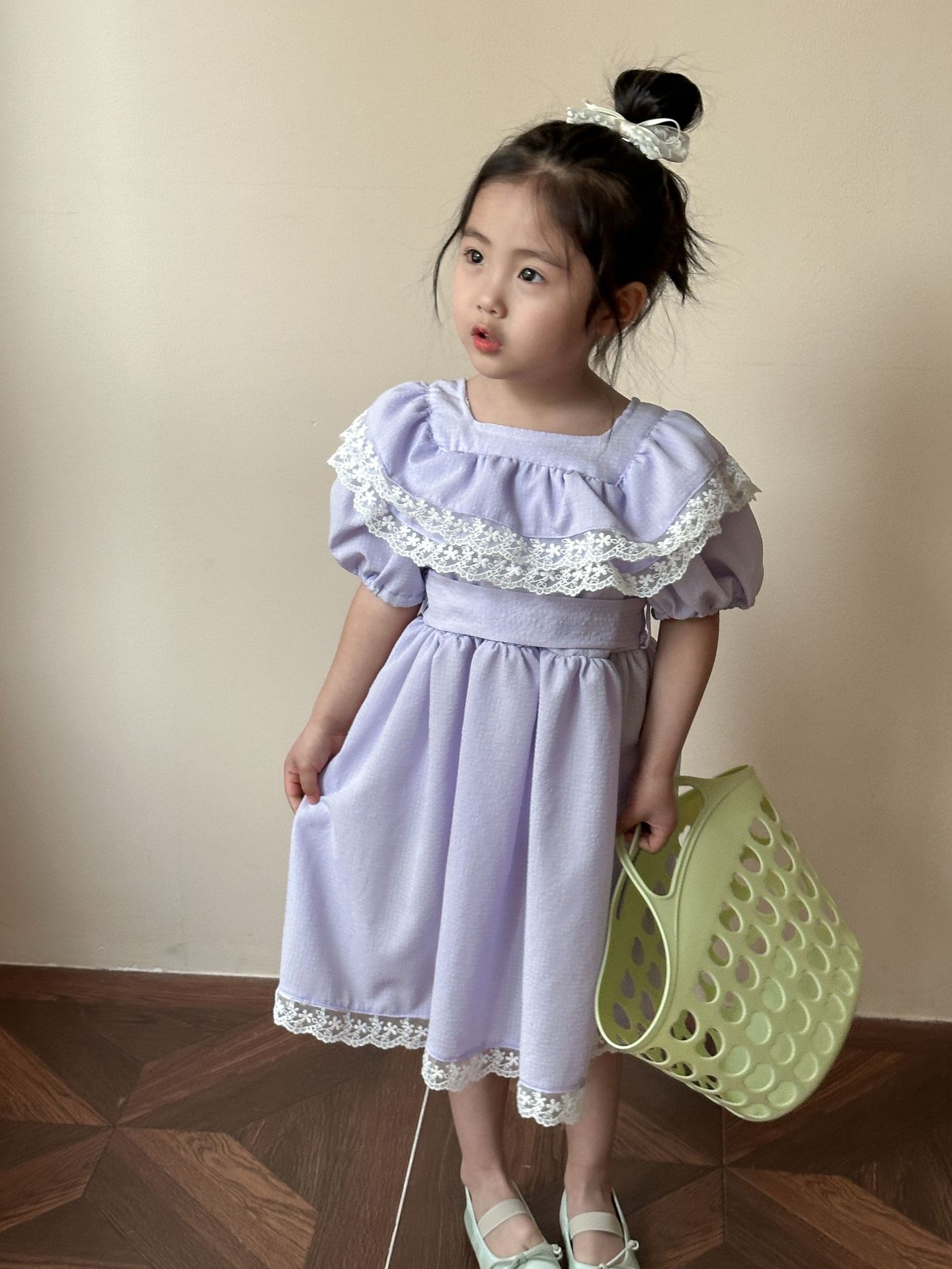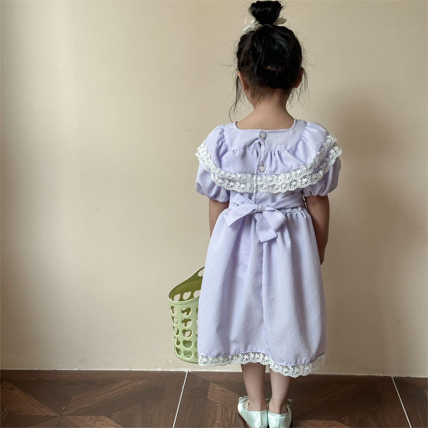 韓国風子供服 キッズ春夏 花柄レース 子供服 ワンピース パフ・スリーブ ワンピ ベルト リボン 90-120cm