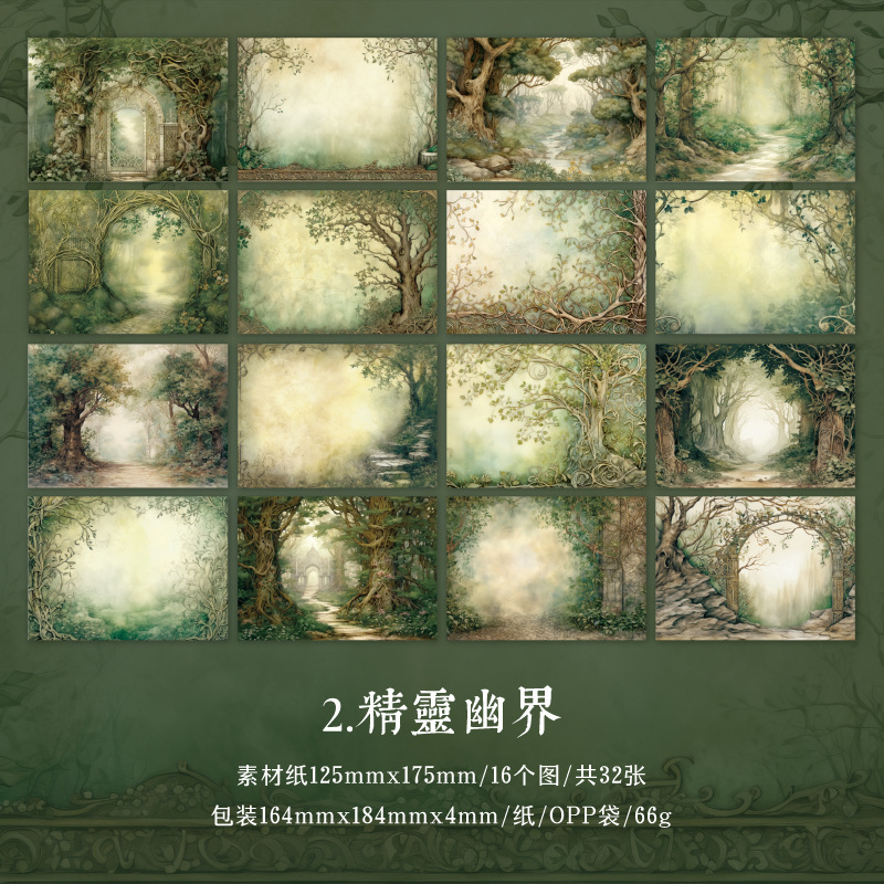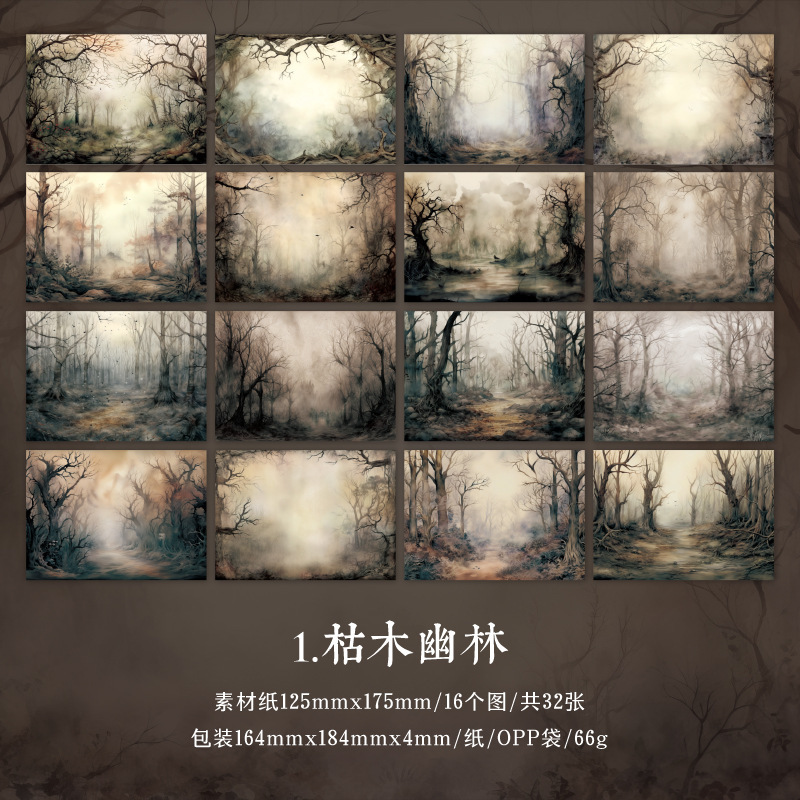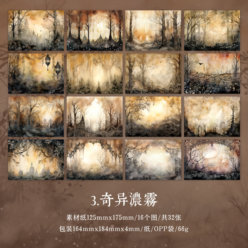 カフェ風 ペーパー アンティーク メモ紙素材紙 ダーク系風景 城 森 32枚入