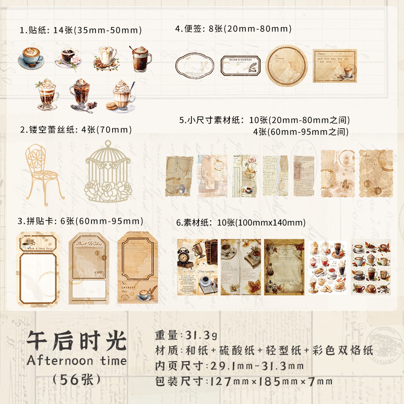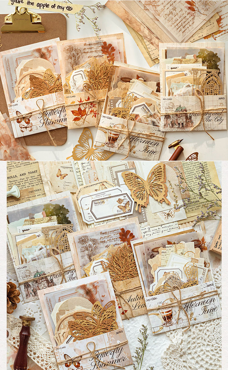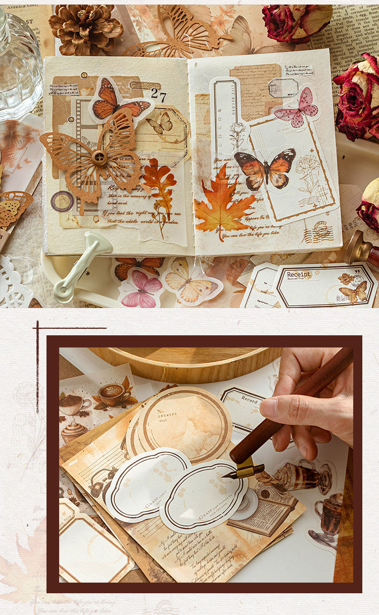 シール ステッカー 素材紙カード メモ紙ペーパー アンティーク 花フラワー バタフライ蝶 珈琲 56枚入