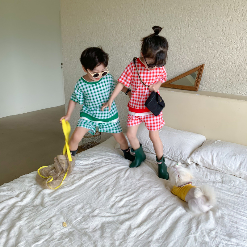 韓国風子供服 2024春夏 姉妹兄弟コーデ チェック柄 上下セット トップス Tシャツ+ズボン 80-140cm
