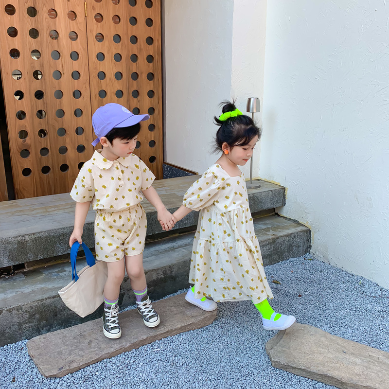韓国風子供服 2024春夏 姉妹兄弟コーデ 花柄 ワンピース&シャツ上着 トップ 半ズボン 80-140cm