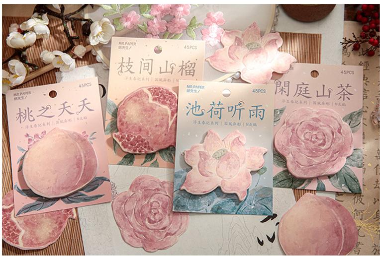 和風 中華風 貼り付け付箋 素材紙メモ紙 ポストイット 夏祭り 花フラワー 桃 蓮 ザクロ 椿 45枚入